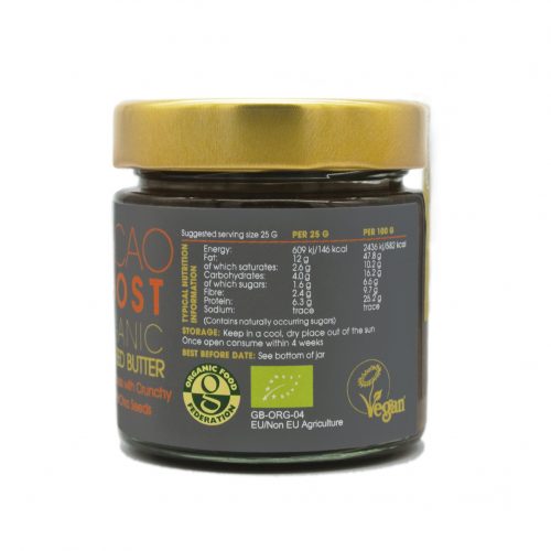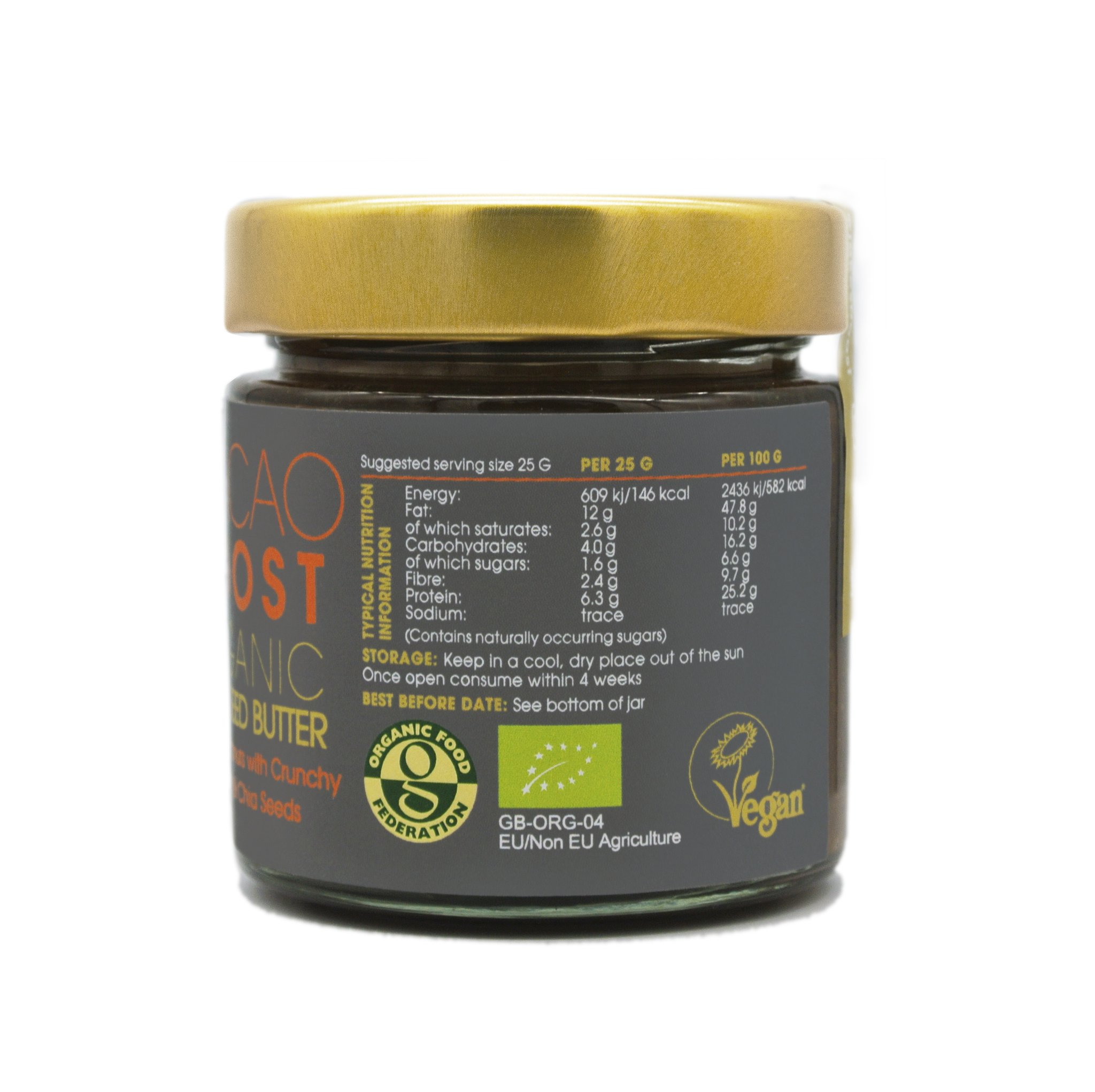 Ingredients: Peanuts*, Cacao nibs*, Chia seeds* (* Certified Organic Ingredient)