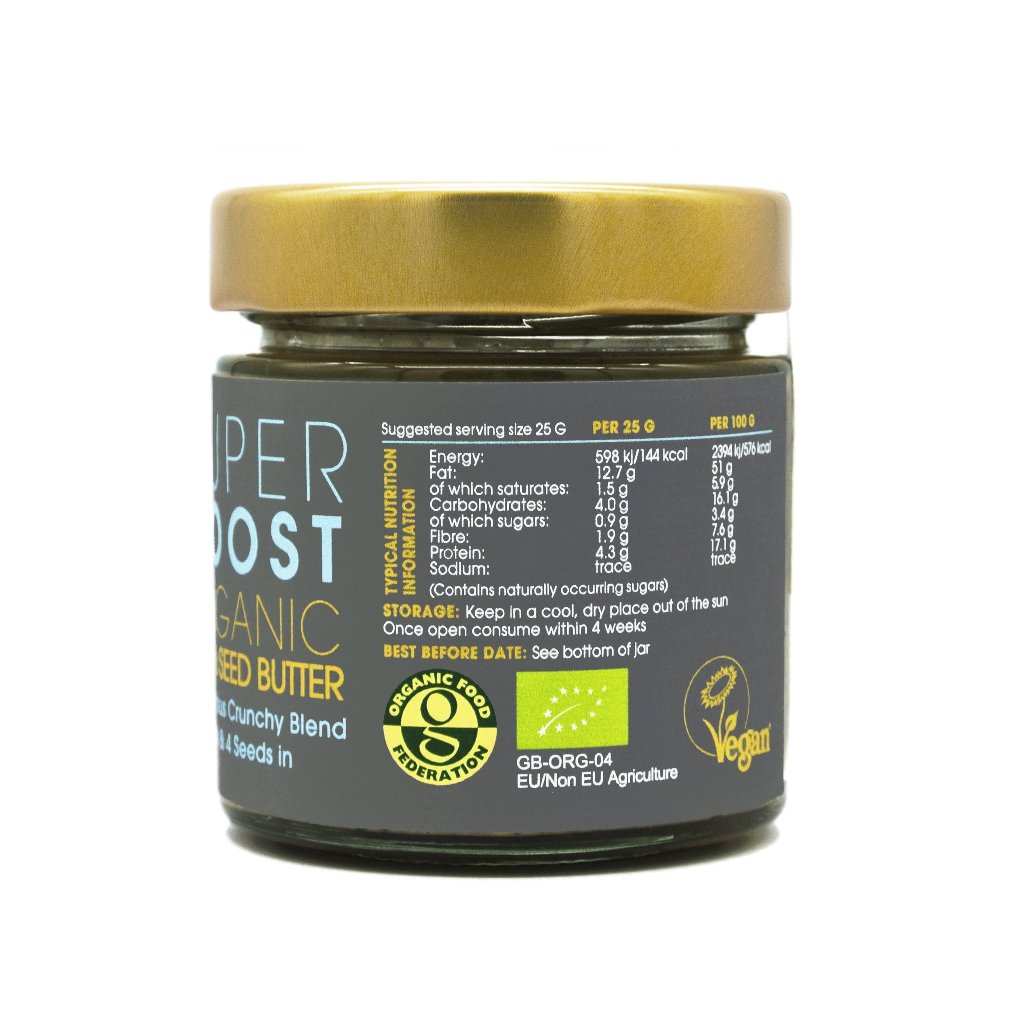 Ingredients: Almonds*, Cashews*, Hazelnuts*, Brazils*, Pecans*, Sunflower Seeds*, Walnuts*, Linseed*, Chia Seeds*, Hemps Seeds* (* Certified Organic Ingredient).