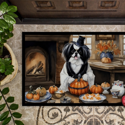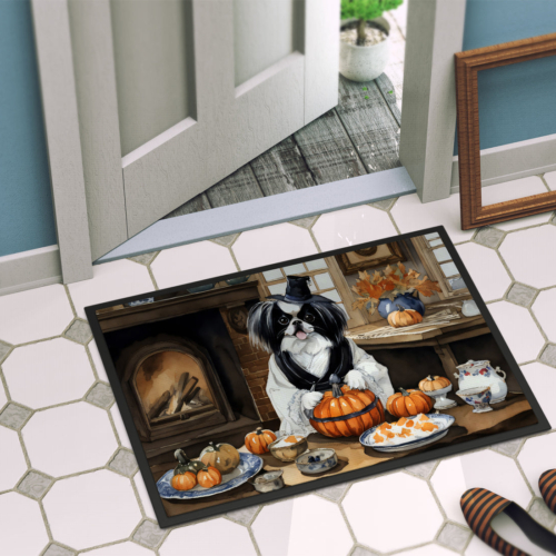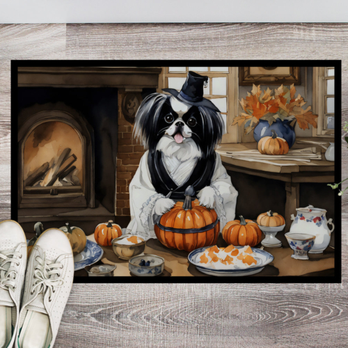 Doormat featuring breed specific Japanese Chin artwork. Celebrate Halloween with this Halloween Doormat. Welcome your guests in style with our Artwork Door Mat, designed to withstand almost any weather condition. This mat, measuring approximately 18 by 27 inches, is held together by durable black binding tape. Its top layer, composed of polyester felt, is dyed with the eye-catching image you see on the mat. A few layers below provide the mat with stability, while its rubber bottom is stamped to help prevent slipping and ensures safety. Our mat works wonderfully as both an indoor or outdoor door mat. For cleaning, simply hose it off with water or use a power washer – no need for any cleaner that produces suds. Avoid scrubbing with a brush, instead, opt for the vacuum on floor setting. Designed manufactured and printed in the USA, this mat is a perfect addition to your porch, outdoor kitchen, entryway, or any indoor space. Its unique design makes it a charming decorative rug that greets your guests and adds a stylish touch to your home decor.