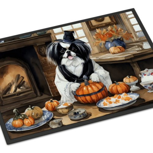 Doormat featuring breed specific Japanese Chin artwork. Celebrate Halloween with this Halloween Doormat. Welcome your guests in style with our Artwork Door Mat, designed to withstand almost any weather condition. This mat, measuring approximately 18 by 27 inches, is held together by durable black binding tape. Its top layer, composed of polyester felt, is dyed with the eye-catching image you see on the mat. A few layers below provide the mat with stability, while its rubber bottom is stamped to help prevent slipping and ensures safety. Our mat works wonderfully as both an indoor or outdoor door mat. For cleaning, simply hose it off with water or use a power washer – no need for any cleaner that produces suds. Avoid scrubbing with a brush, instead, opt for the vacuum on floor setting. Designed manufactured and printed in the USA, this mat is a perfect addition to your porch, outdoor kitchen, entryway, or any indoor space. Its unique design makes it a charming decorative rug that greets your guests and adds a stylish touch to your home decor.