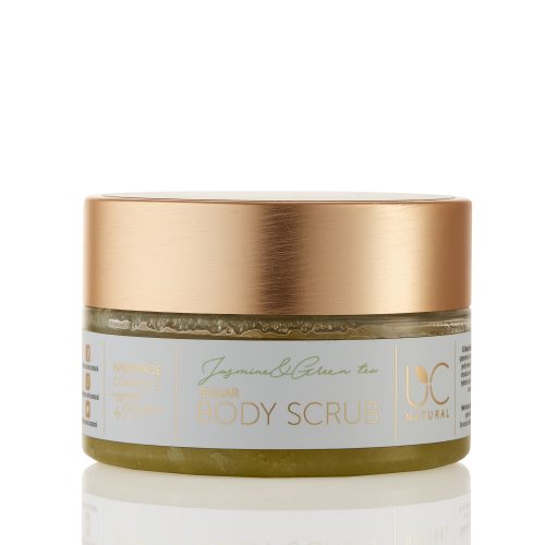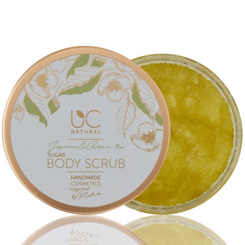 UC Natural Handmade Sugar Body Scrub is enriched with olive and grapeseed oil, cocoa butter, shea butter, and beeswax. This natural blend gently removes keratinized particles, improves blood circulation, and stimulates metabolism in the skin. After use, the skin gets nourished, hydrated, and soft. The natural aroma of Jasmine-Green tea will leave a marvelous and long-lasting scent on your body.