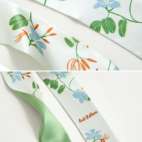 Breathe fresh elegance into your style with the Jasmine Tea skinny scarf. Delicate florals and soft greens bloom across silky white, bringing a whisper of spring to any outfit. Tie it around your neck, hair, or bag for an effortlessly polished look. Product Description: 100% Mulberry Silk 55″L x 2″W (140cmx5cm) OEKO-Tex Certified