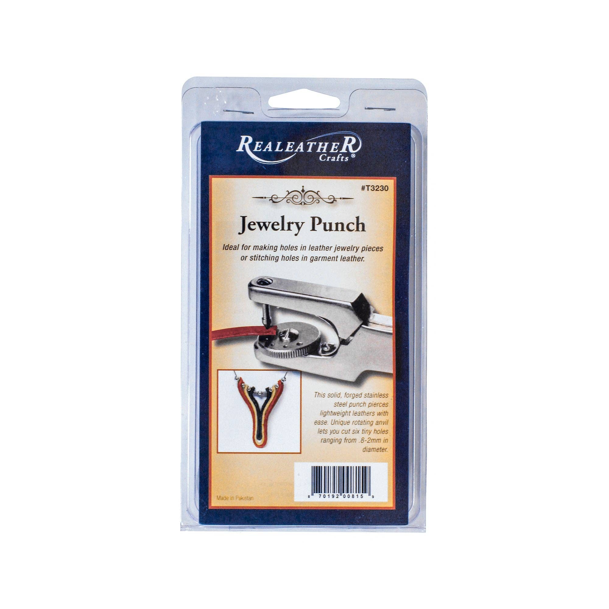 A jewelry makers handiest of tools. This solid, forged stainless steel punch pierces lightweight leathers with ease. Rotary hole wheel offers 6 different sizes, from .8 mm to 2 mm with easy adjustment. Hole range: 6 sizes, .8 mm – 2 mm