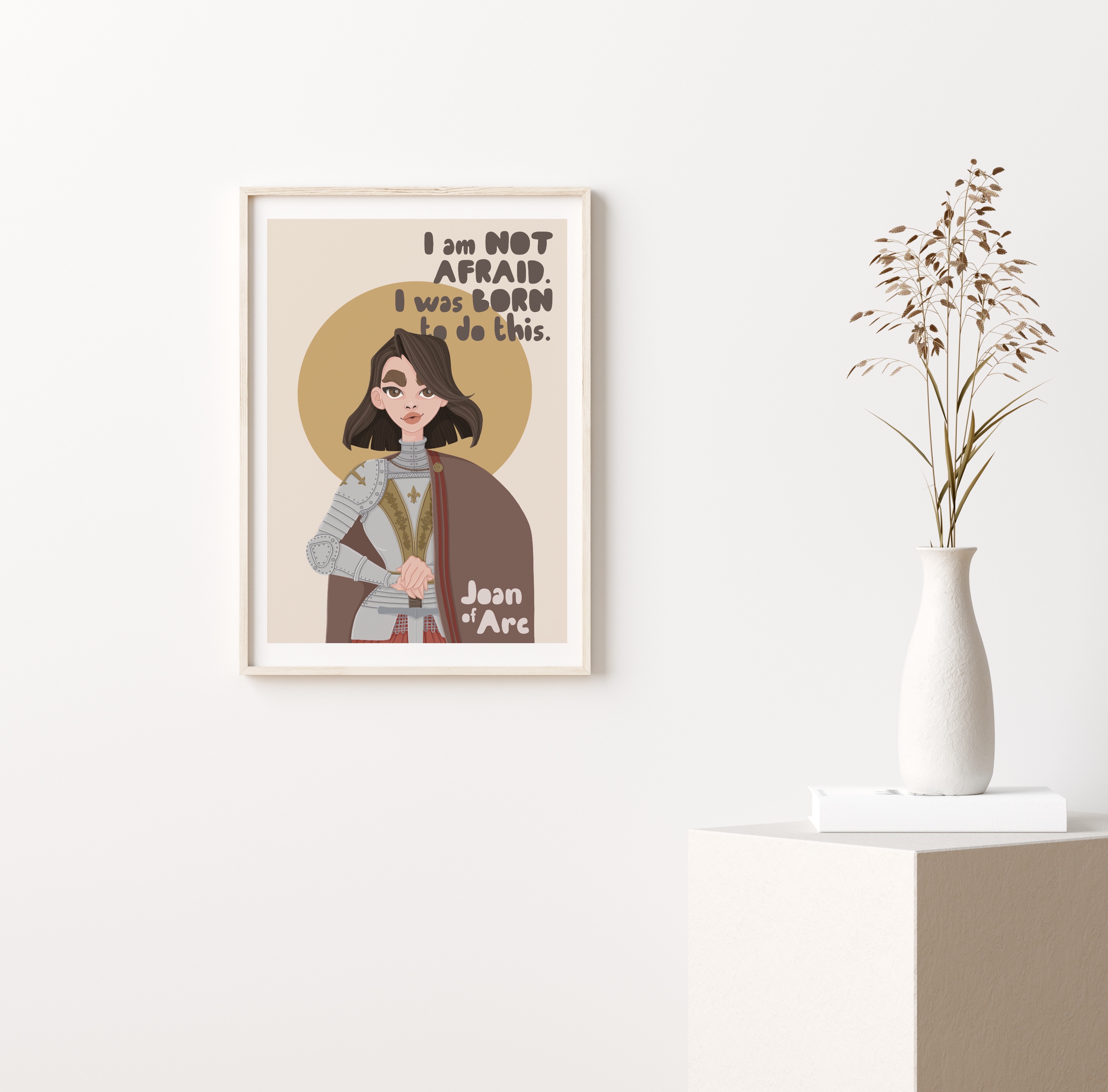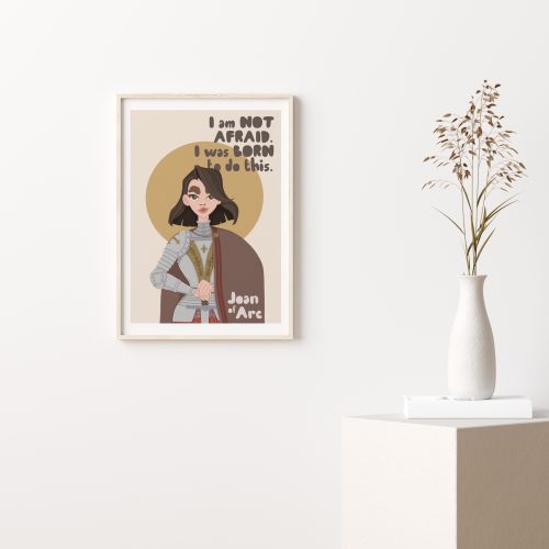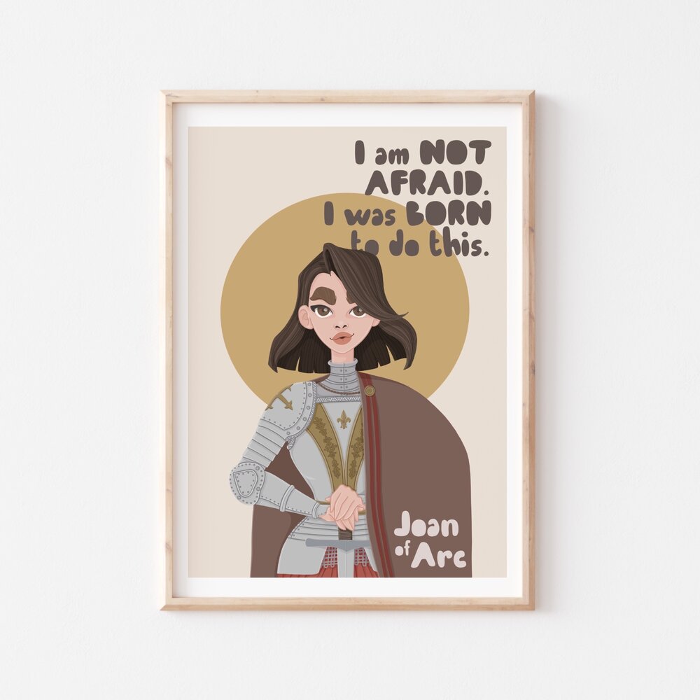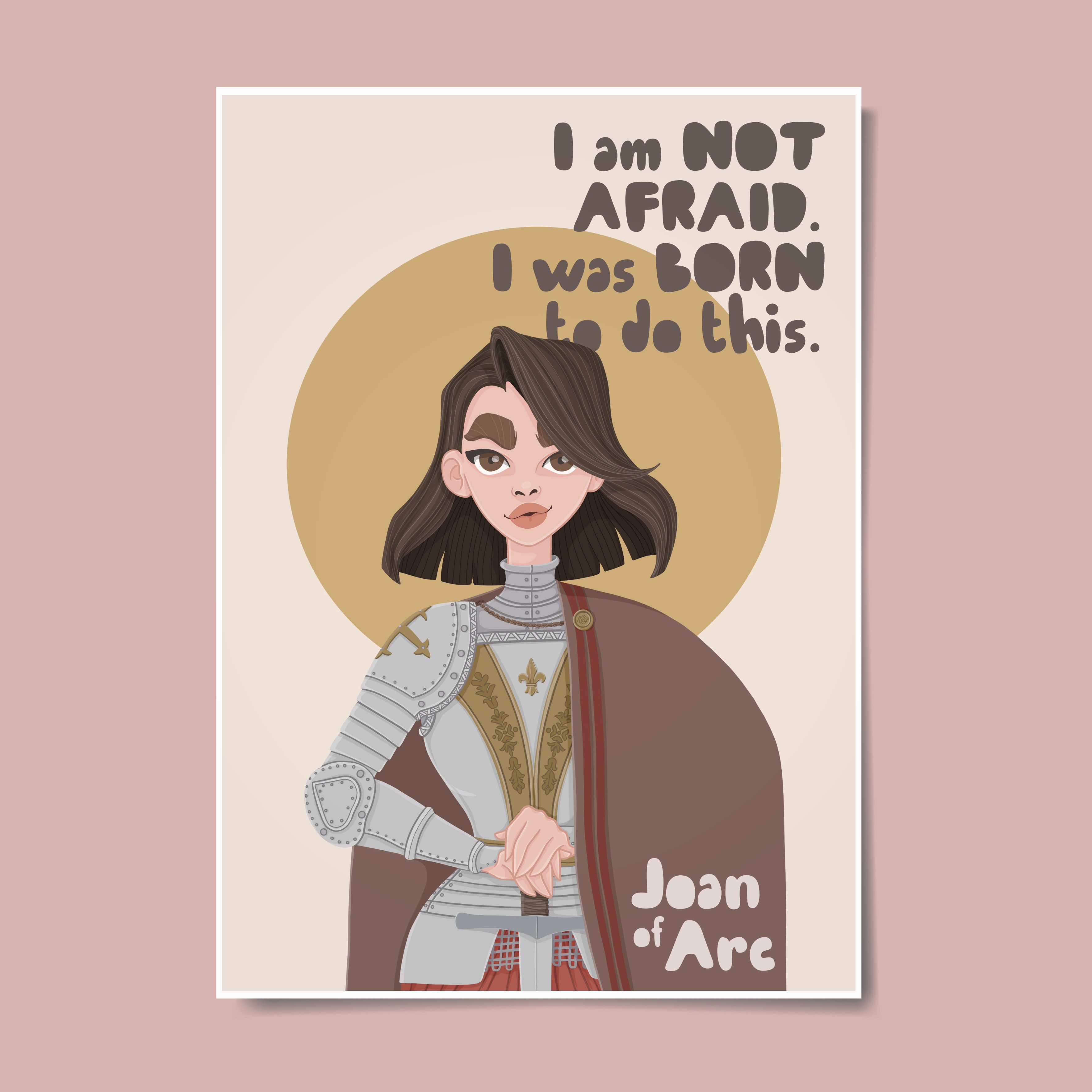 Design: Original illustrated portrait of Joan of Arc with a quote which says:
