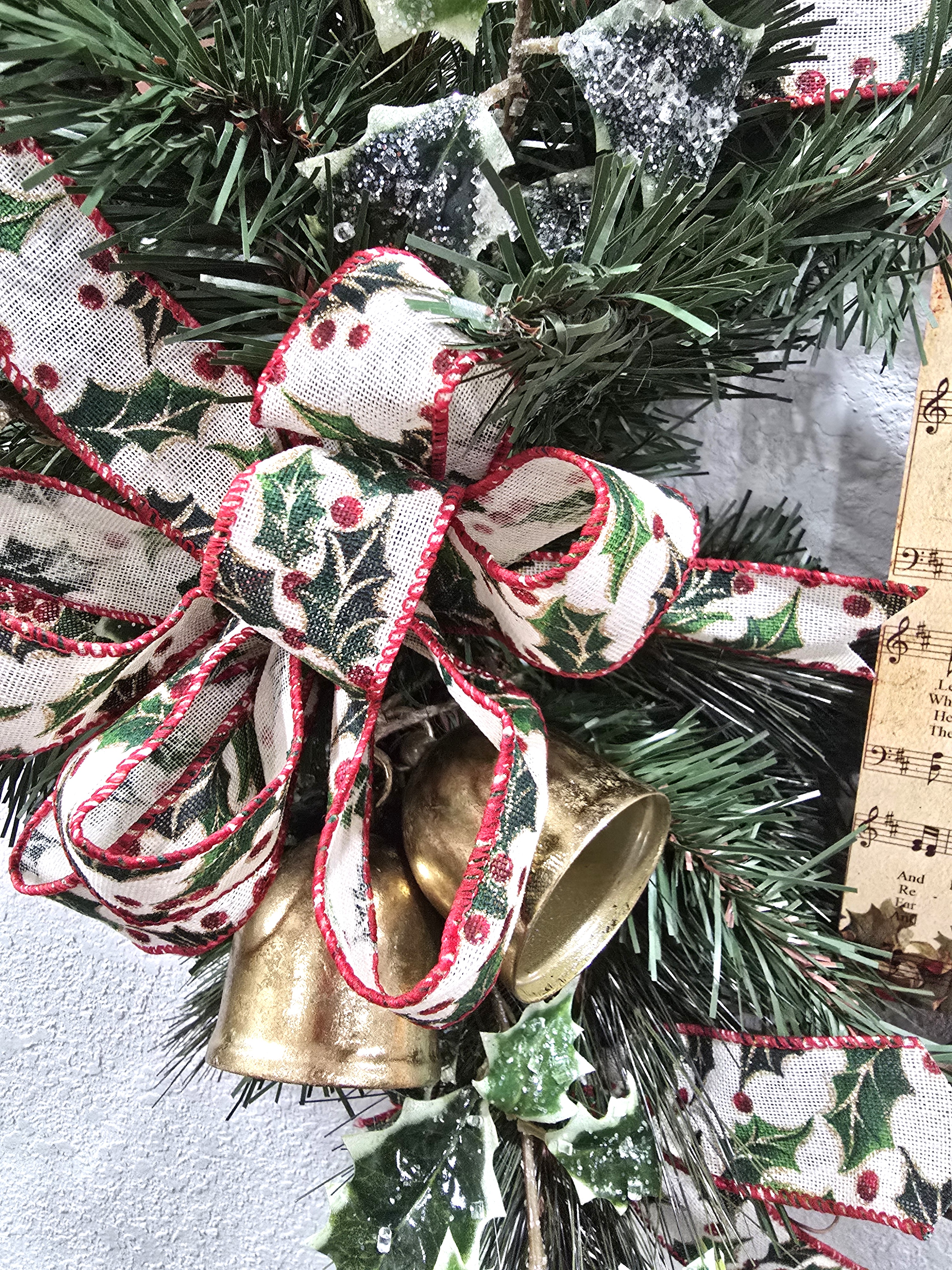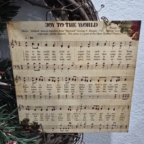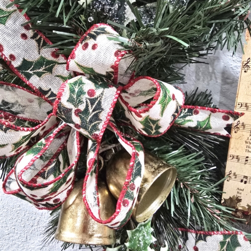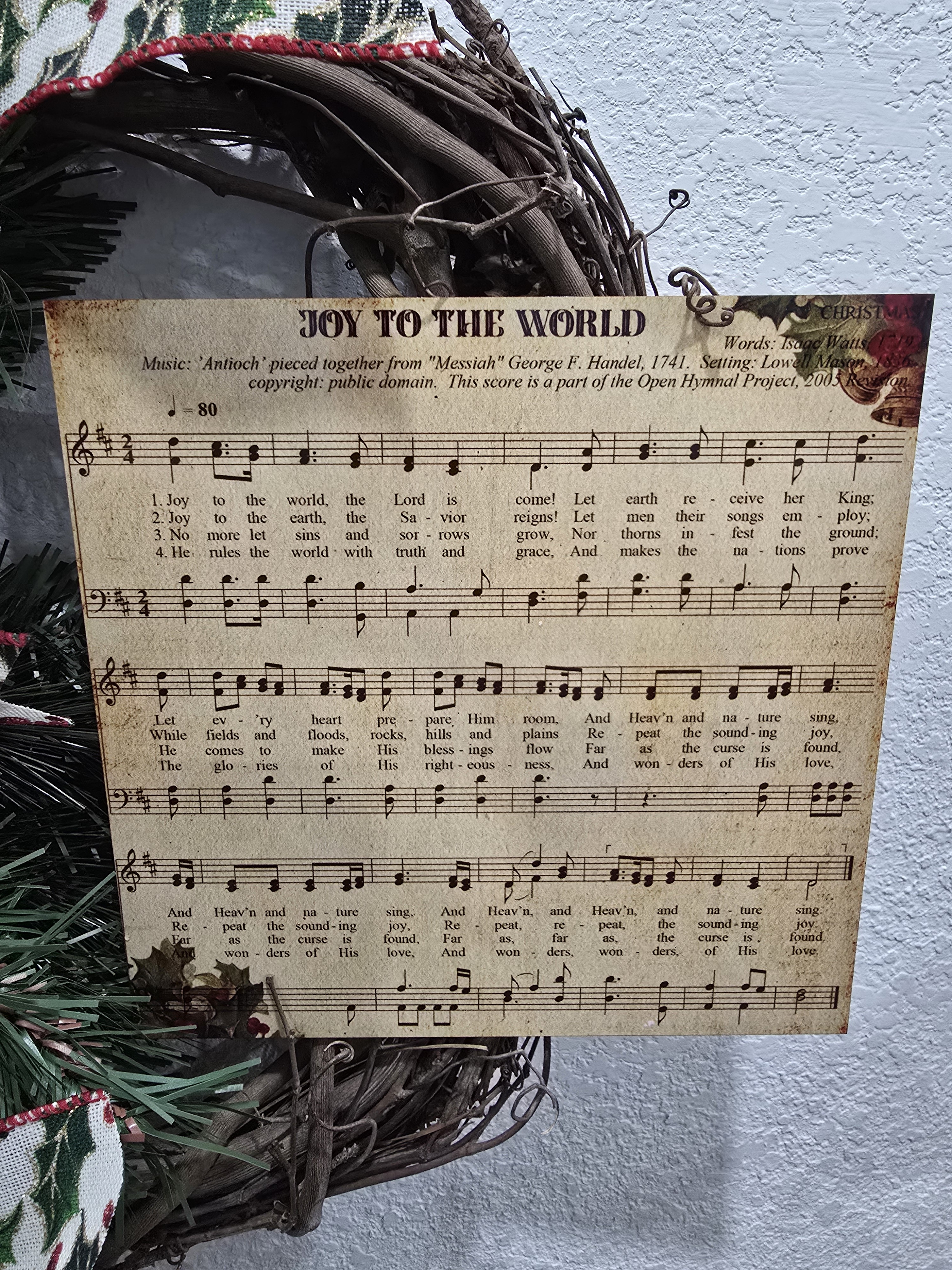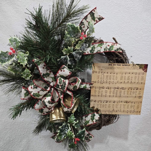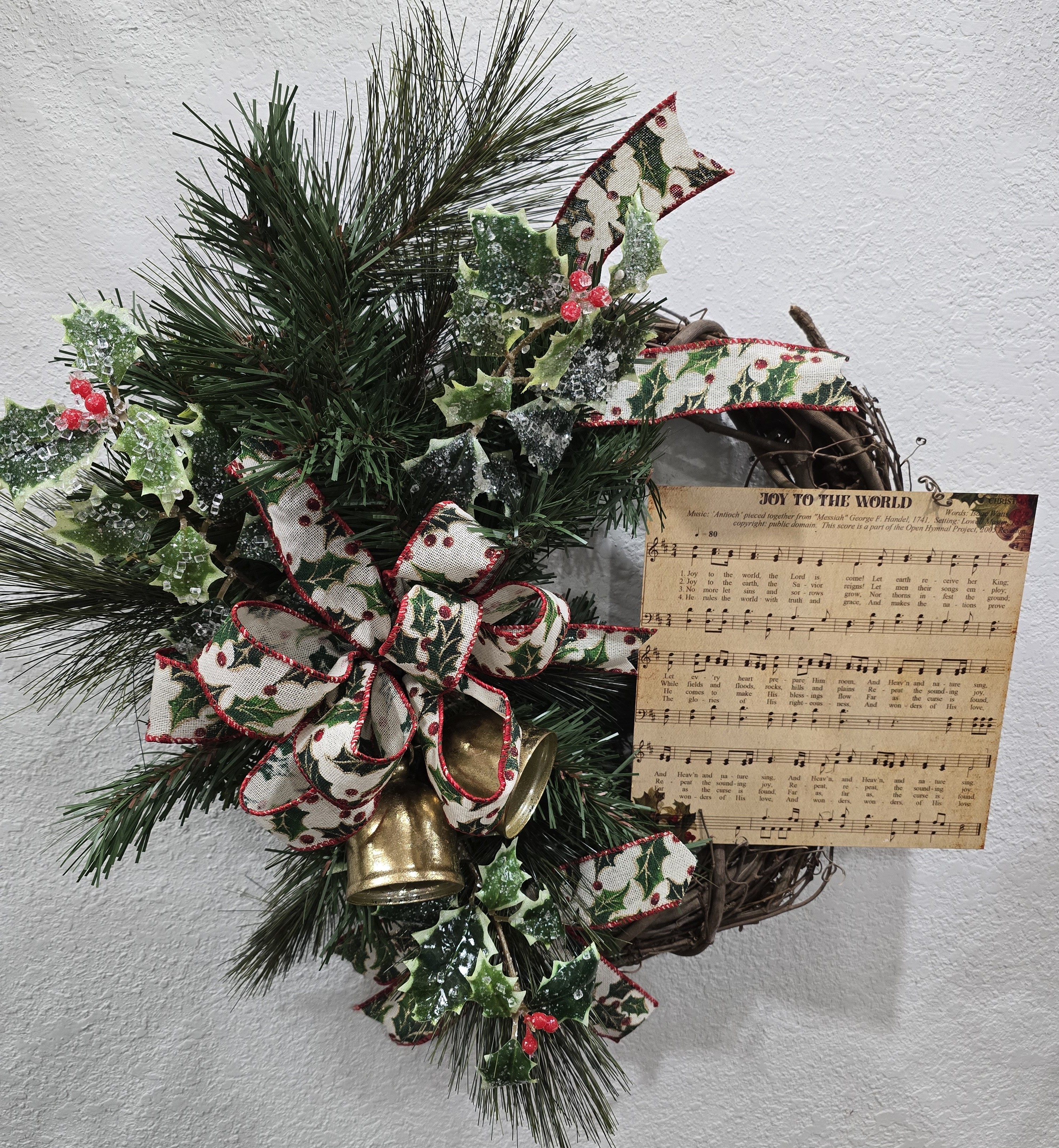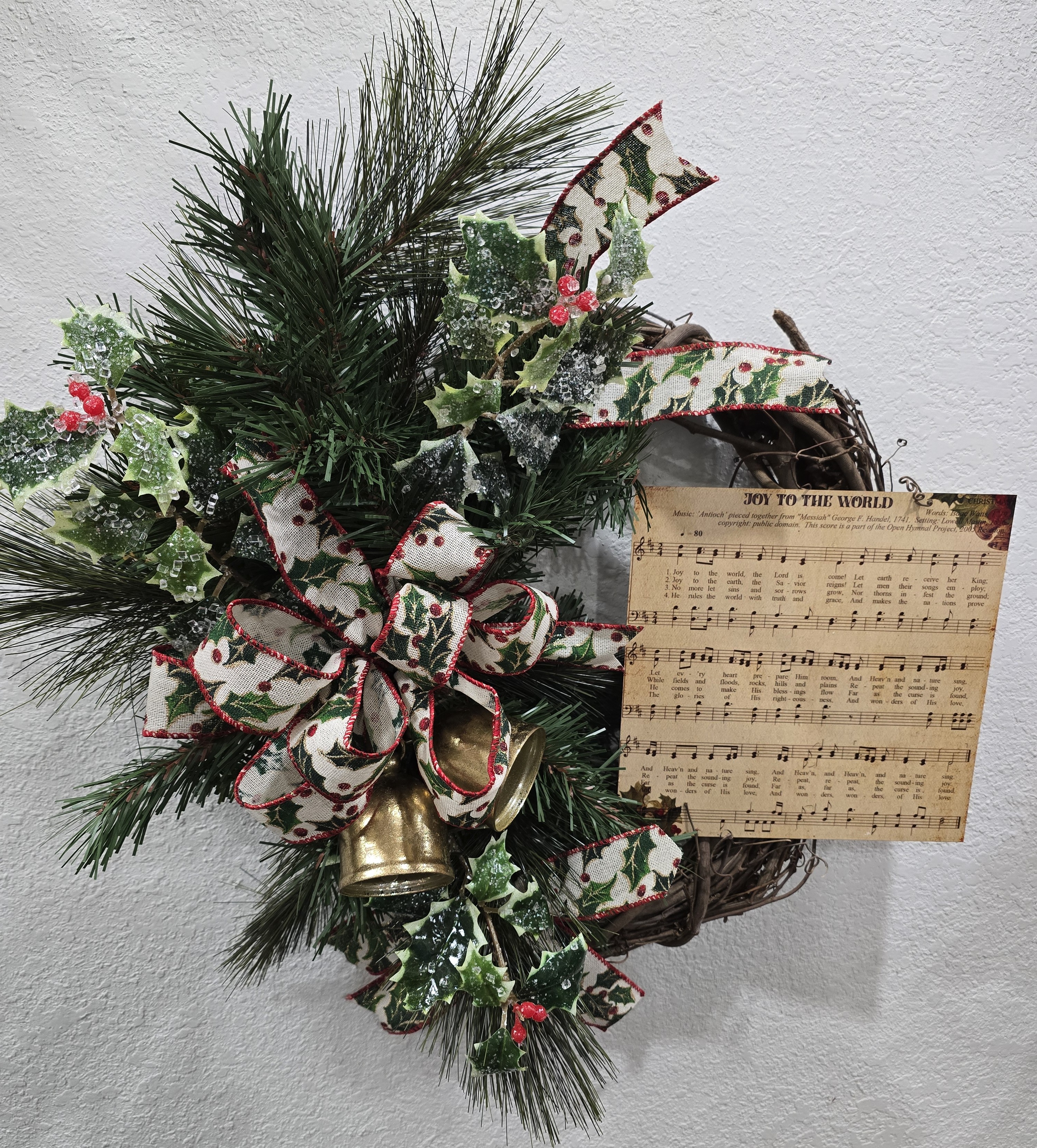 Decorate your door or wall with this Joy to the World wreath. Handmade on a 14 inch grapevine base, this wreath is full of faux greenery, faux iced holly, 2 small gold bells, a bow with holly and berries, and a sign, made of aluminum, that has the song Joy to the World. The wreath measures approximately 17x17x4. Each wreath is handmade and made to order.