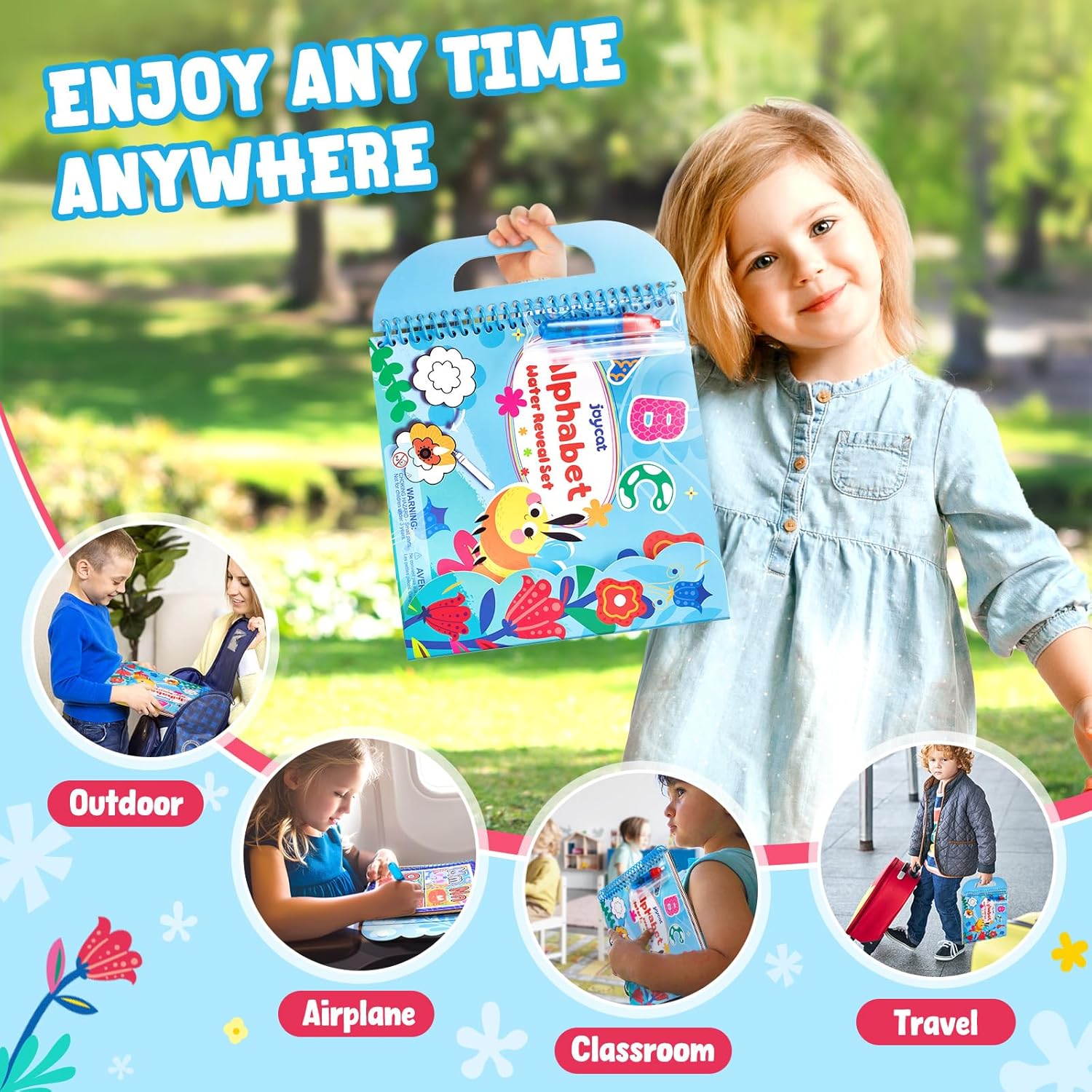 “Bigger Size, More Pages:Experience our expansive format! This jumbo water coloring book features 14 full-sized pages, measuring a generous 8.66 x 8.66 inches. Compared to other versions, this larger canvas gives little toddler artists more room to paint and explore, significantly extending playtime and engagement for the best value available Engaging Alphabet Learning:Turn letter practice into play! This reusable water book is designed for early learners, covering all 26 uppercase and lowercase letters. Each letter features clear, step-by-step tracing guides to teach correct stroke order. Paired with “”A is for Apple”” style image association and the spelled-out word, it helps build a strong connection between letters, sounds, and meanings Discover Hidden Surprises on Every Page:The magic goes beyond the letters! As your child paints with the water pen, they’ll reveal a full, hidden surprise scene on every page (like animals or nature). This “”seek-and-find”” element boosts toddler curiosity and makes learning an exciting, screen-free adventure they’ll want to experience repeatedly The Ultimate On-the-Go, No-Clean-Up Activity:The perfect travel companion for your toddler! This water coloring activity is 100% mess-free, using only clean water—no paints, no chemicals, and no stains. The book comes with a built-in carrying handle and a dedicated pen pouch, making it ideal for keeping kids happily occupied during travel Reusable & Eco-Friendly:Watch the magic disappear as pages dry, then start fresh for new adventures! This reusable water book is designed for repeated use, offering lasting value that outshines disposable activity pads. It’s the eco-friendly choice that grows with your child—more durable than regular coloring books, more engaging, and made to last”
