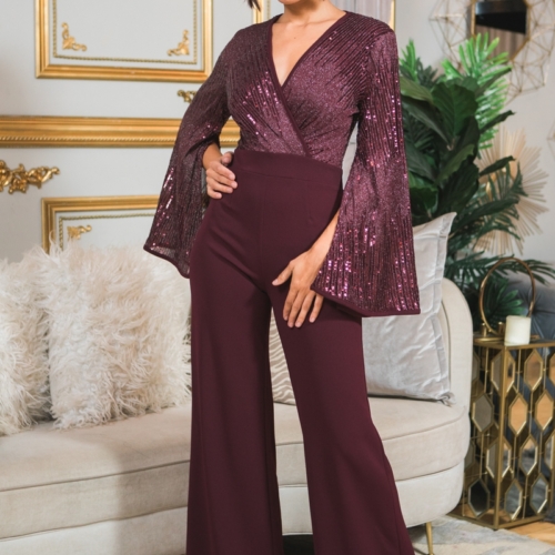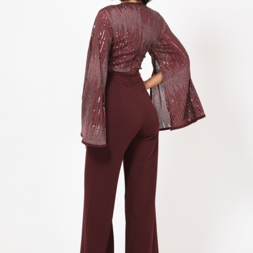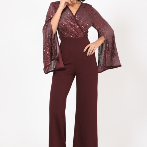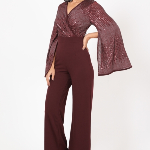 –	Overlap Sequin Jumpsuit w/ Split Bell Sleeve
