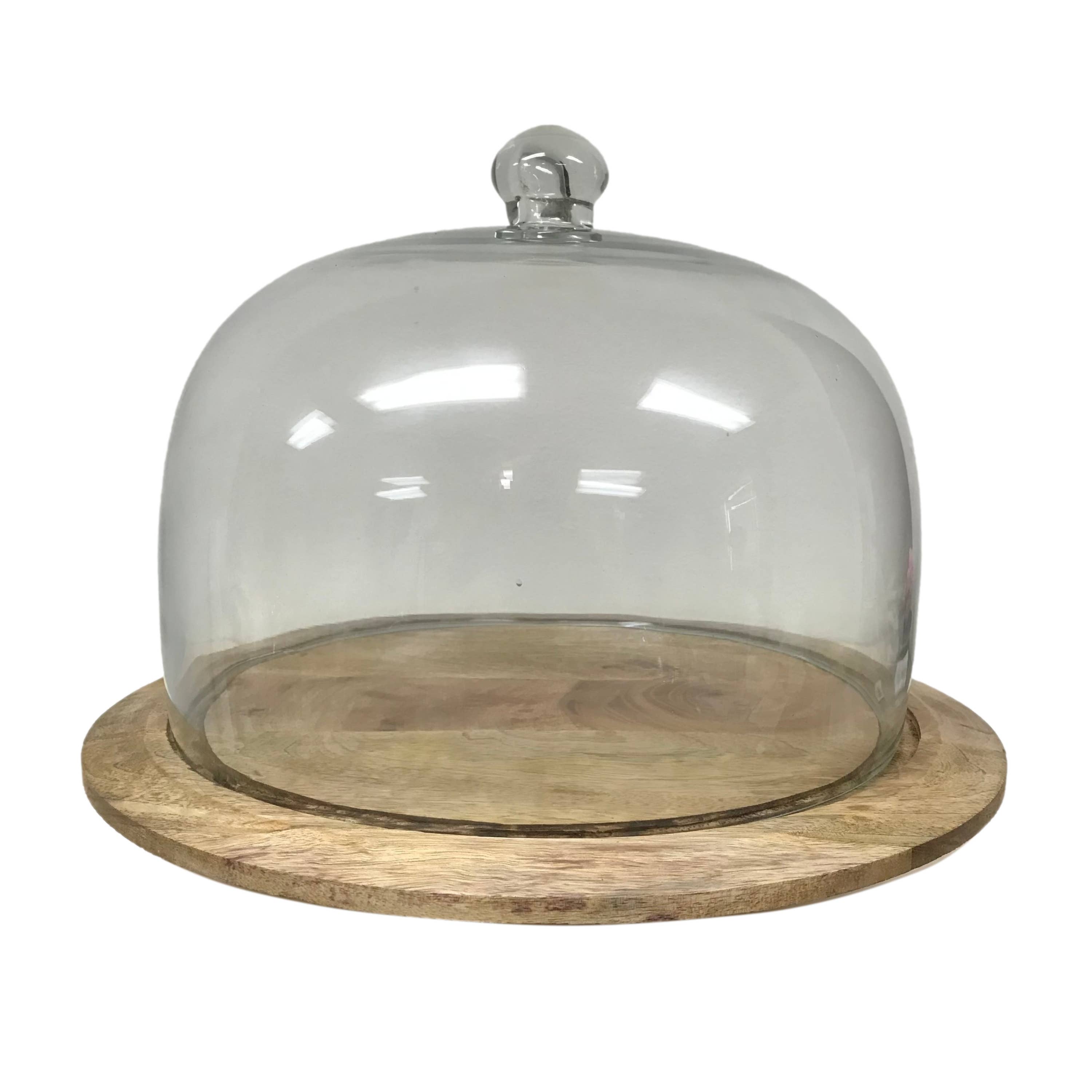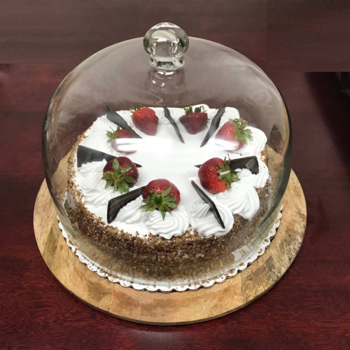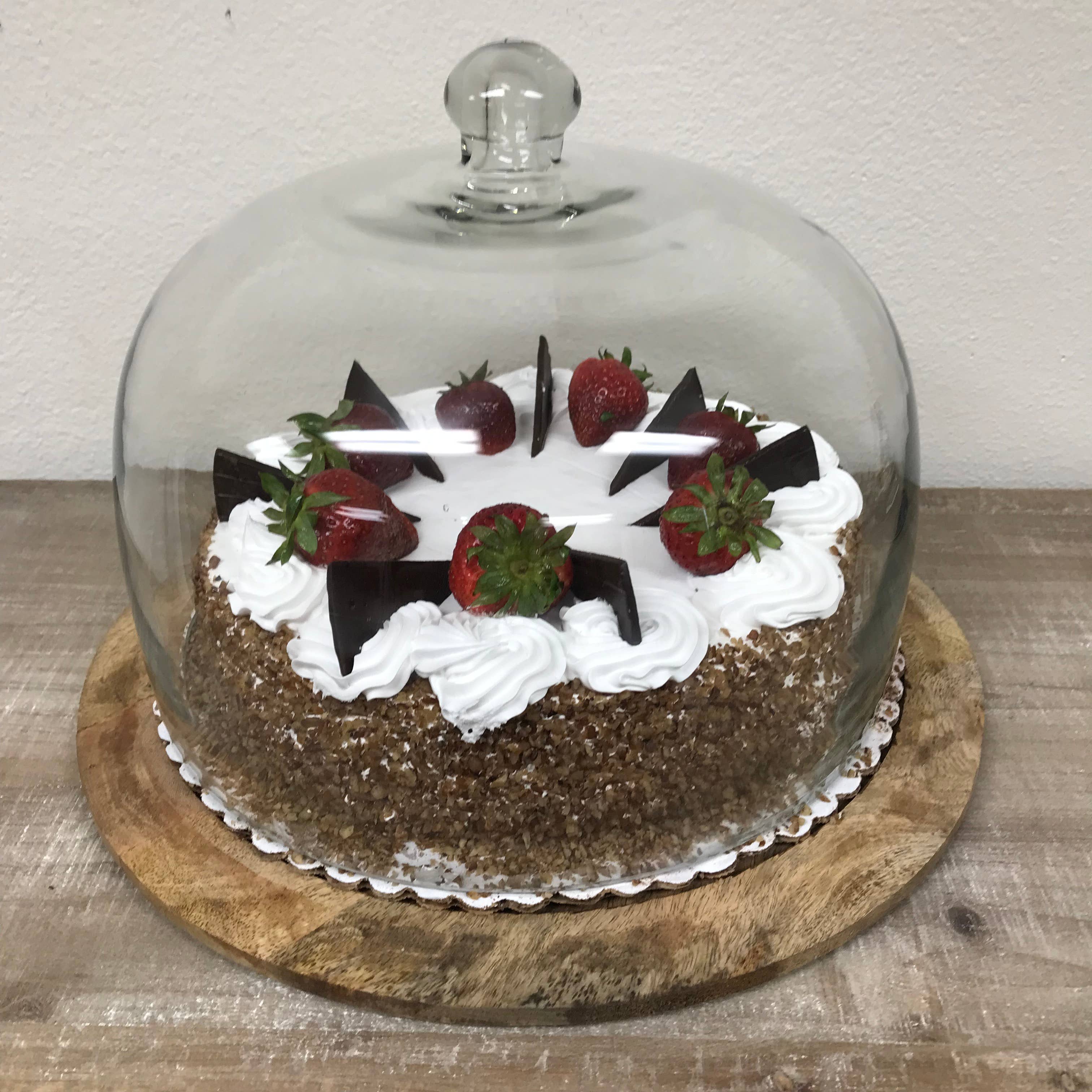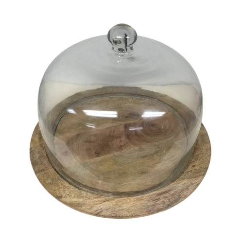 Julia’s Master Baker Cake Dome. Mango Wood Food Safe Base with Glass Dome. Dome fits into grooved channel to preserve freshness. Boxed size: 17x17x13″ 9 lbs.