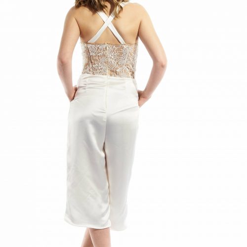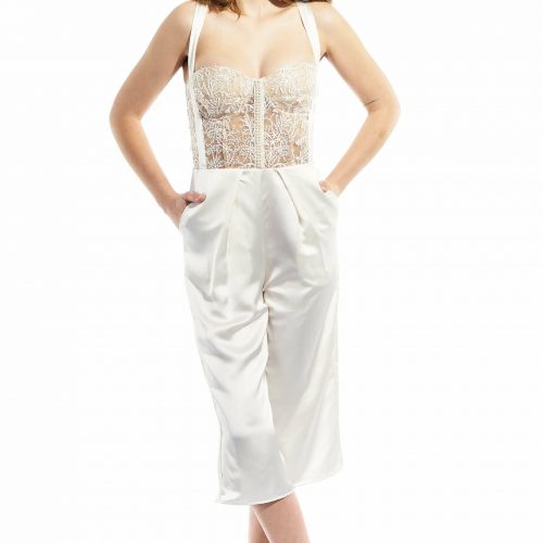 The light jumpsuit consists of a transparent corsage with fine lace details and adorned with pearls in the middle. The cups are lightly padded and thus replace the bra. The culottes made of silk satin give the jumpsuit an elegant look and a cool style at the same time.