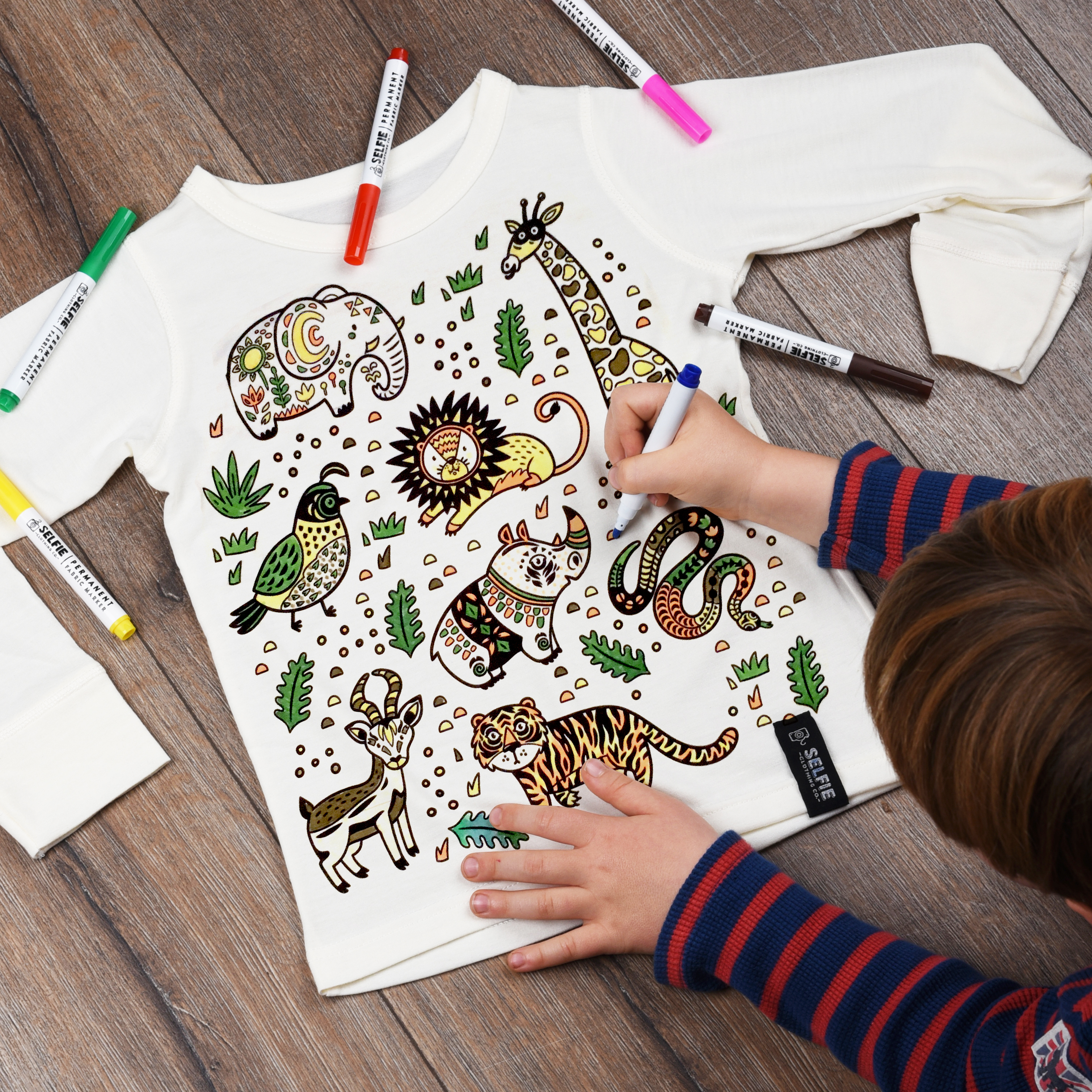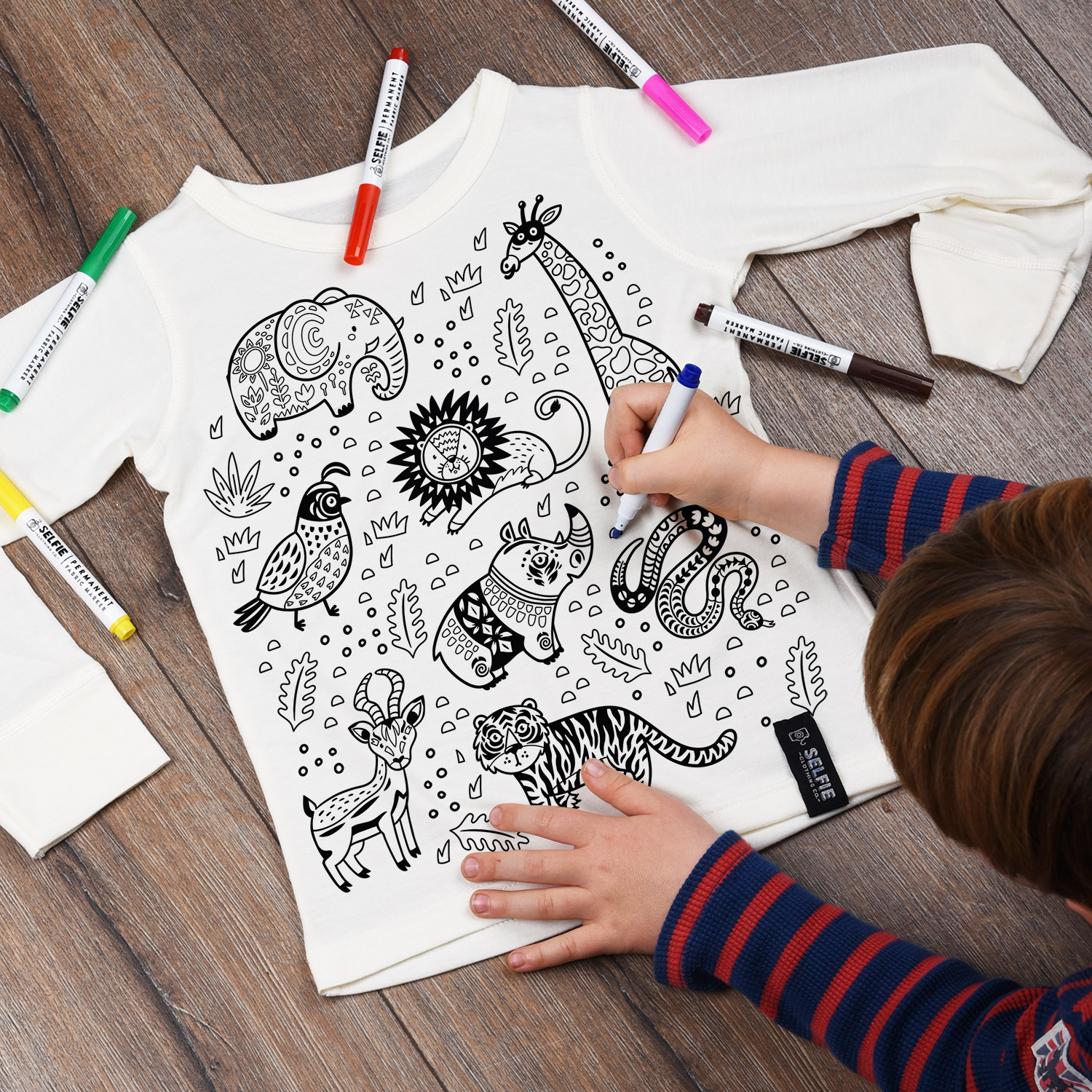 The lightweight jersey blend top features a unique jungle colour in design, ready for your little ones to get creative with. The fabric pens use high-quality UV ink which can be air cured for 24 hours or ironed by a parent. The colours will not fade and can be worn time and time again.