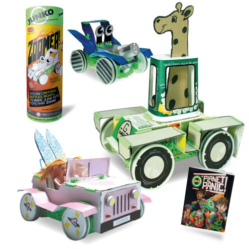Made in the UK from recycled plastic and designed to last, you can use your JUNKO Zoomer! Kit again and again…heck young creators can make a new toy every day if they want!