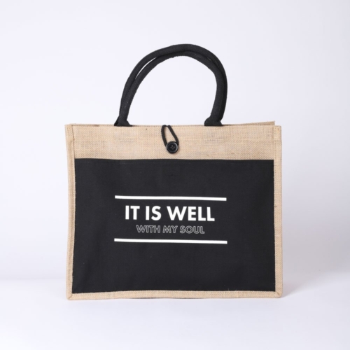 The tote bag also features jute drawstrings with a front button closure, ensuring that your belongings are secure while you’re on the go. Whether you’re carrying books, groceries, or your favorite beach essentials, this tote bag has got you covered.