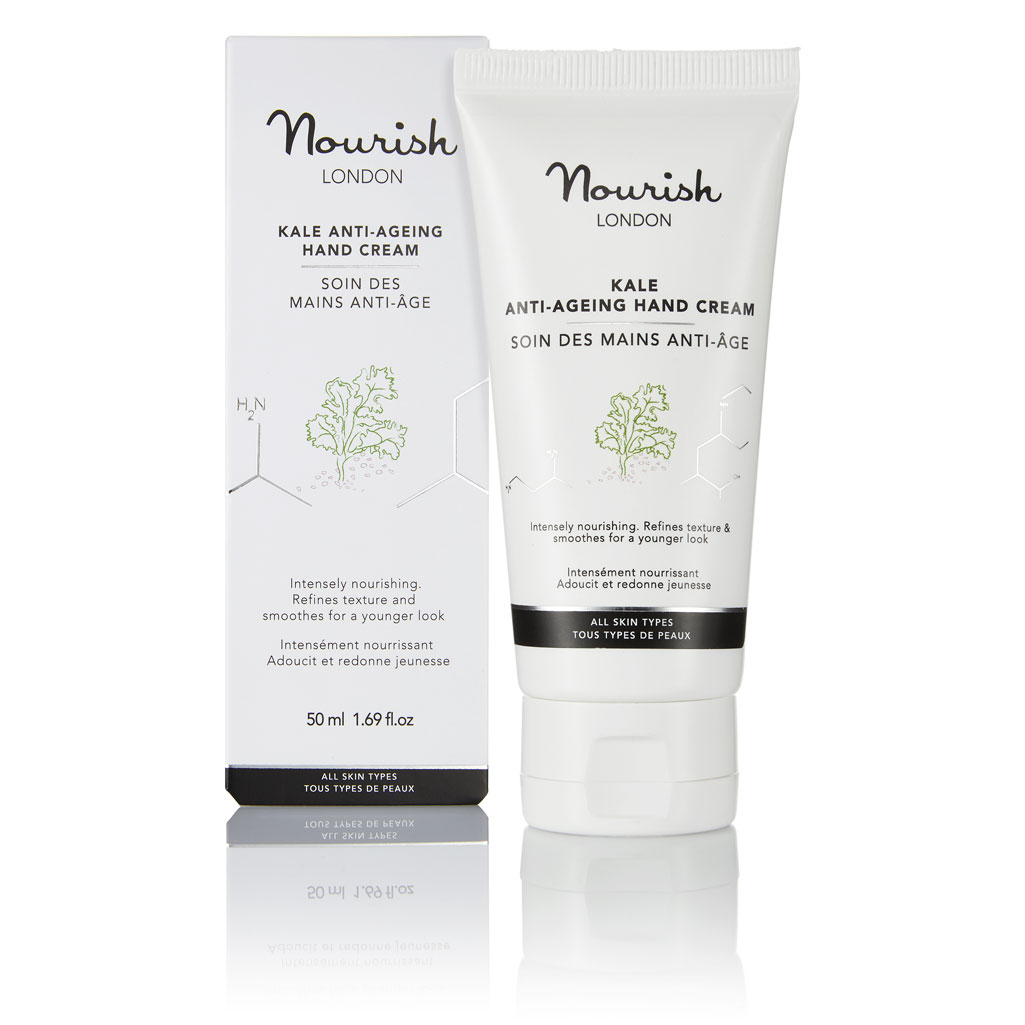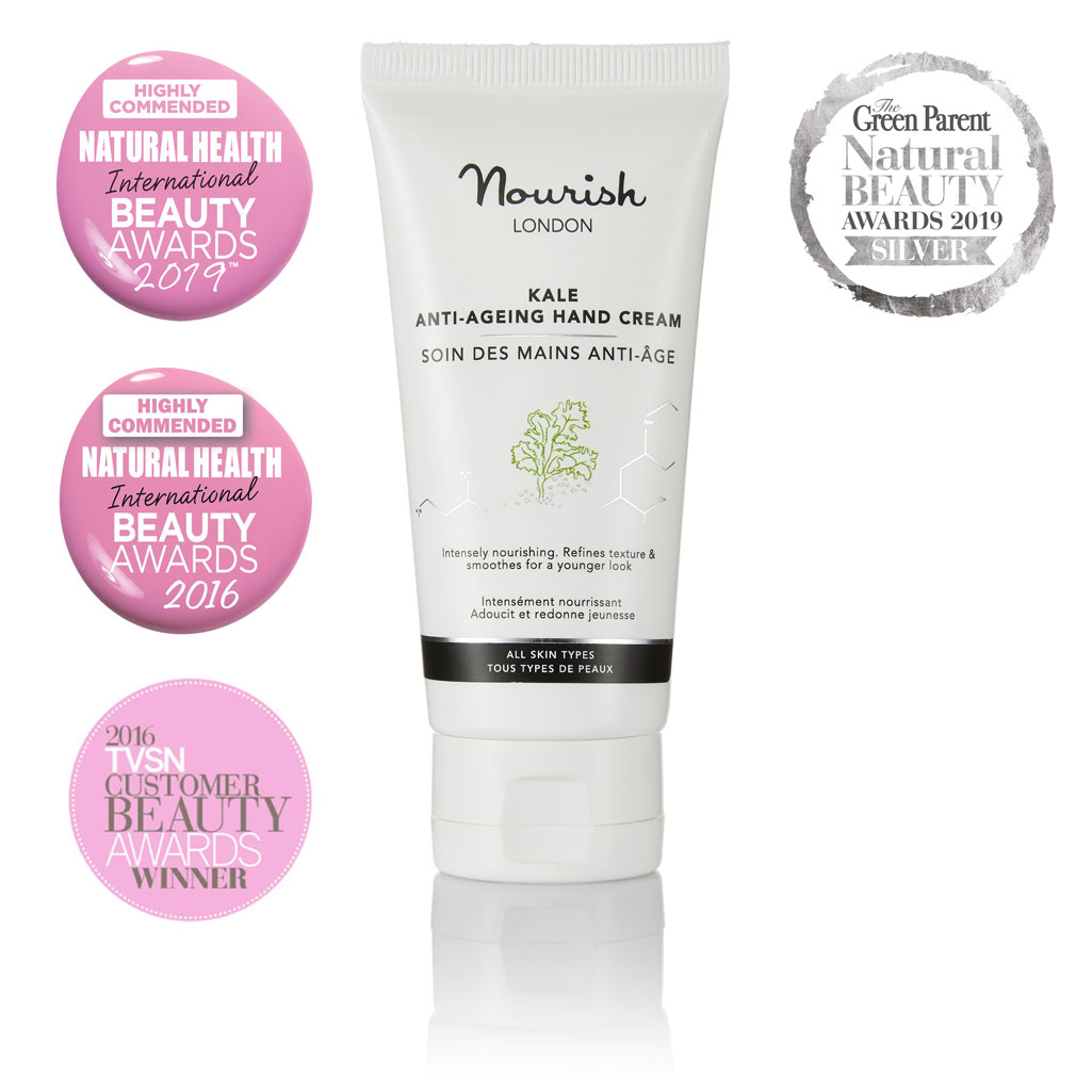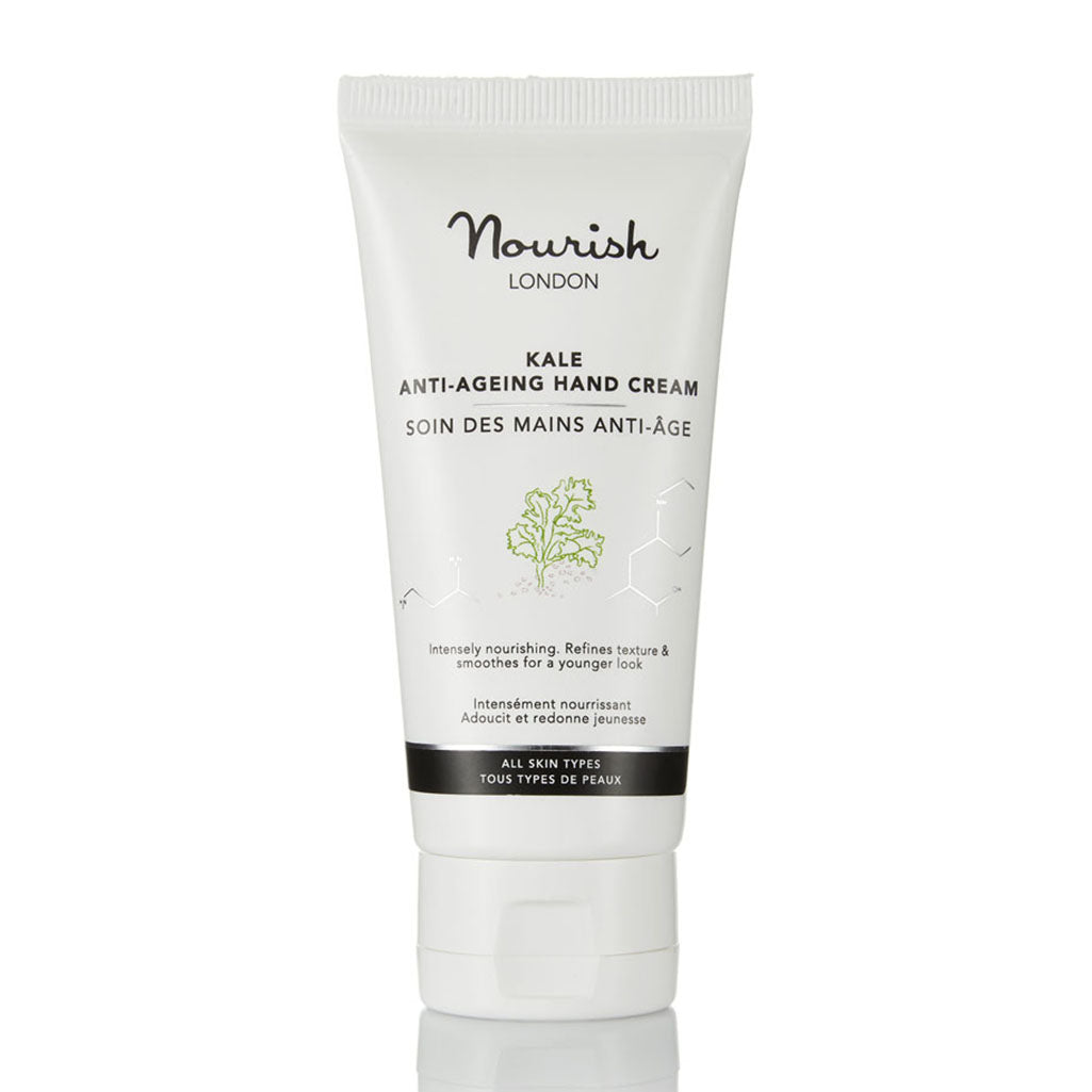 Description Our Kale Anti-Ageing Hand Cream intensely nourishes and hydrates. Refines and smooths skin texture. Reduces the appearance of fine lines and pigmentation for youthful-looking hands. This multi-award-winner is specially formulated with anti-ageing kale, Rose of Jericho, argan oil and hyaluronic acid to hydrate and reduce uneven pigmentation and age spots.Bioactive peptides and antioxidants stimulate collagen and minimise fine lines, while precious essential oils of frankincense, myrrh and neroli help to heal damaged skin. Leaves hands feeling and looking soft, supple and renewed. 75% organic Awards: Highly Commended as Best Anti-Ageing Range – Natural Health Magazine International Beauty Awards 2019 Silver Award as Best Hand Cream – The Green Parent Natural Beauty Awards 2019 Highly Commended as Best Hand Cream – Natural Health Magazine International Beauty Awards 2016 Winner in Best Hand, Nail & Body Category – TVSN 2016 Customer Beauty Awards Nourish London skincare formulations are 100% vegan, made with natural organic ingredients, alcohol (ethanol) free & cruelty-free.