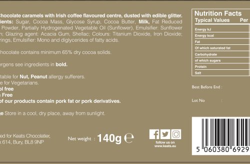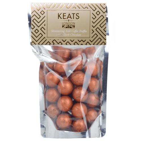 •Sumptuously indulgent dark chocolate truffles in a stylish contemporary pouch. •Mouth watering Irish Coffee flavour dark chocolate shimmering truffles dusted in metallic shimmer.