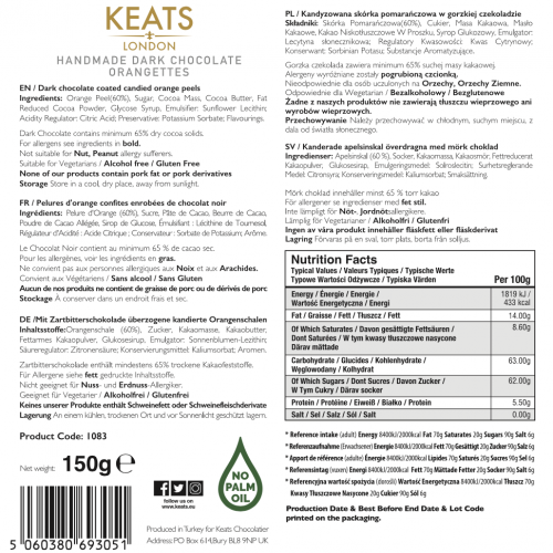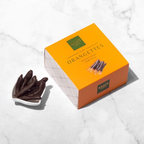 With all the essence and flavour of orange chocolate but with the added texture of actual orange peels; Keats dark chocolate handmade Orangettes provide a fantastic tasting experience. Boxed in a quaint high quality box with coloured sleeve, for elegant display.