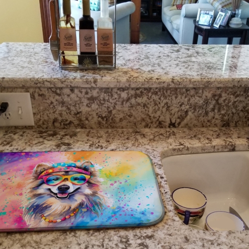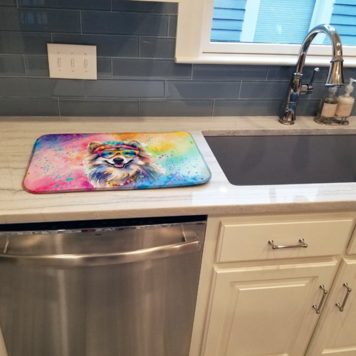 Dish Drying Mat featuring breed specific Keeshond artwork. Say goodbye to messy countertops and soggy dish towels with our innovative dish drying mat. Our high-quality dish drying pad is designed to keep your countertops dry while offering a stylish and efficient solution. Whether you’re air drying dishes, glasses, stemware, silverware, pots, pans, bottles, or even fruits and vegetables, our dish mat is the perfect choice. The 14 inches x 22 inches size fits most counters and dish drying racks, and the non-slip design ensures stability. Made with water-absorbent polyester and a polyurethane foam insert, our dish drying mat is not only functional but also durable. It’s machine washable and printed in the USA for long-lasting use. The beautiful artwork adds flair to your kitchen decor, making it a perfect housewarming gift or present for any occasion. Upgrade your kitchen experience with our absorbent and versatile dish drying mat.