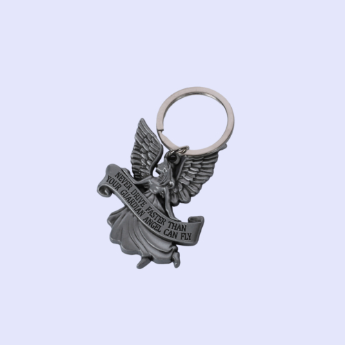 This silver metal keychain features a beautifully detailed angel design with a banner across the front that reads, Never drive faster than your guardian angel can fly. Measuring 1.75L x 2.25H, itís the perfect size for your keys, bag, or other personal items. This keychain is a thoughtful reminder of divine protection, offering a message of safety and faith. The angel design represents guidance and care, making this a meaningful accessory for anyone. The keychain comes with a durable circular keyring attached for easy use and long-lasting functionality. Its sleek silver finish complements any style, making it both stylish and spiritual. Ideal for personal use, this keychain also makes a wonderful gift for friends, family, or anyone who values a constant reminder of their guardian angel. Sold in a pack of four, it’s perfect for sharing with loved ones or keeping a few on hand for yourself. Whether youíre traveling, driving, or simply carrying it with you, this keychain ensures youíre never far from the comforting presence of your guardian angel. A great gift for any occasion, this keychain combines faith and function in one beautiful, meaningful piece.