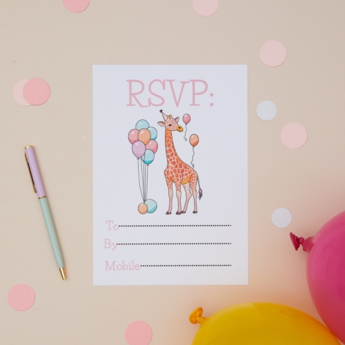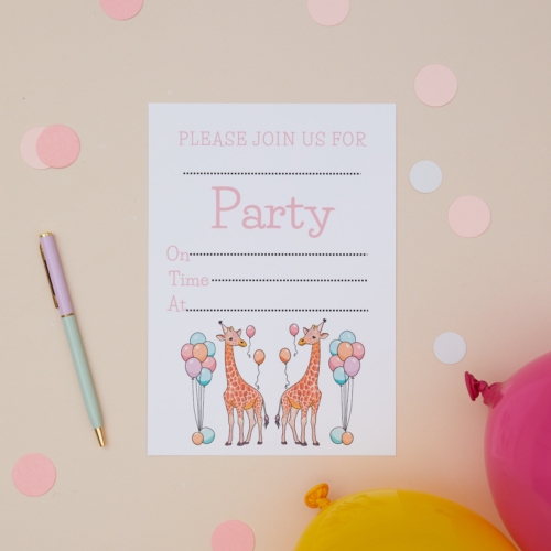 Stretch into celebration mode with these Giraffe Kid’s Birthday Party Ready To Write Invites!
