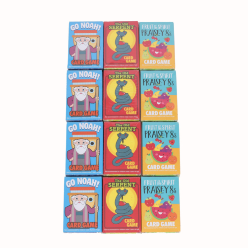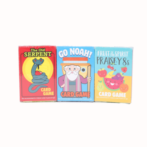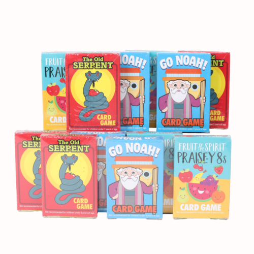 In Praise-y 8s, players match pairs and challenge their memory, while The Old Serpent is a fun, strategy-based game where players outwit their opponents. In Go Noah! participants gather pairs of animals and learn about the biblical story of Noahís Ark in an engaging and educational way. Each game comes with clear instructions on the back of the pack, making it easy for players to quickly learn the rules and start having fun.