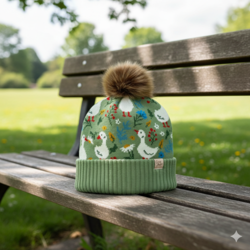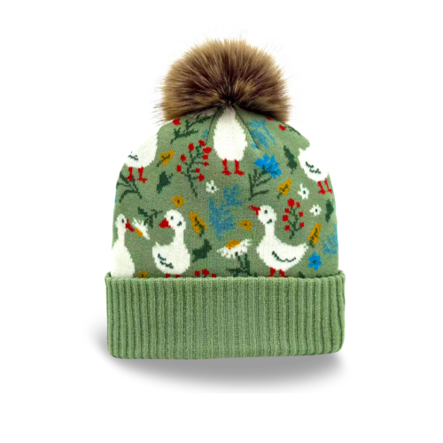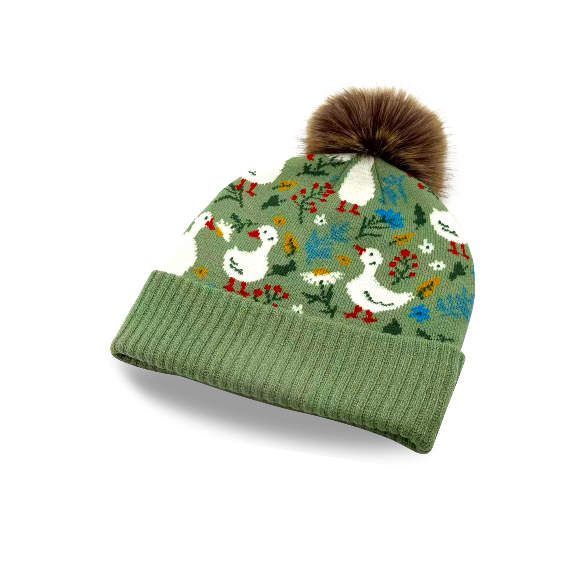 This Kids Goose Pattern Pom Knit Beanie is designed to bring warmth and gentle charm to everyday cold-weather wear. Inspired by playful farm-style illustrations and nature details, the repeating goose motifs are paired with flowers and foliage, creating a calm, storybook-inspired look that feels friendly and comforting. A soft green base sets a natural tone, while subtle accent colors add visual interest without overwhelming the design. The evenly spaced pattern keeps the overall look balanced and easy to style, making this beanie a natural fit for daily outfits, outdoor play, and seasonal layering. Crafted from soft knit fabric, this beanie provides cozy warmth with a lightweight, comfortable feel. The fold-over ribbed cuff offers a secure fit for growing kids, and the fluffy pom pom adds a classic winter finish with a playful touch. Designed for everyday wear, travel, and thoughtful gifting, it’s a charming accessory kids will enjoy wearing again and again. ✿Key Features Soft knit construction for comfortable warmth and everyday wear Playful goose pattern with a clean, balanced illustrated layout Fold-over cuff and pom pom detail for a cozy winter look ✿Kids Size: Fits most kids, suitable for head circumference 52–54 cm. ✿Key Retail Sales Channels This beanie is a versatile wholesale item that works well for a variety of retailers, including: Gift shops in tourist destinations and cultural landmarks Fashion boutiques that focus on trendy and seasonal accessories Lifestyle concept stores that carry unique, design-forward pieces College campus shops and bookstores with a youthful, playful audience Holiday markets and seasonal pop-up shops looking for eye-catching winter essentials