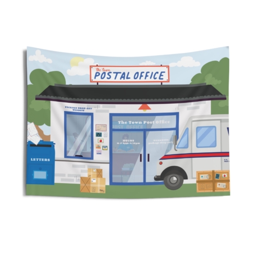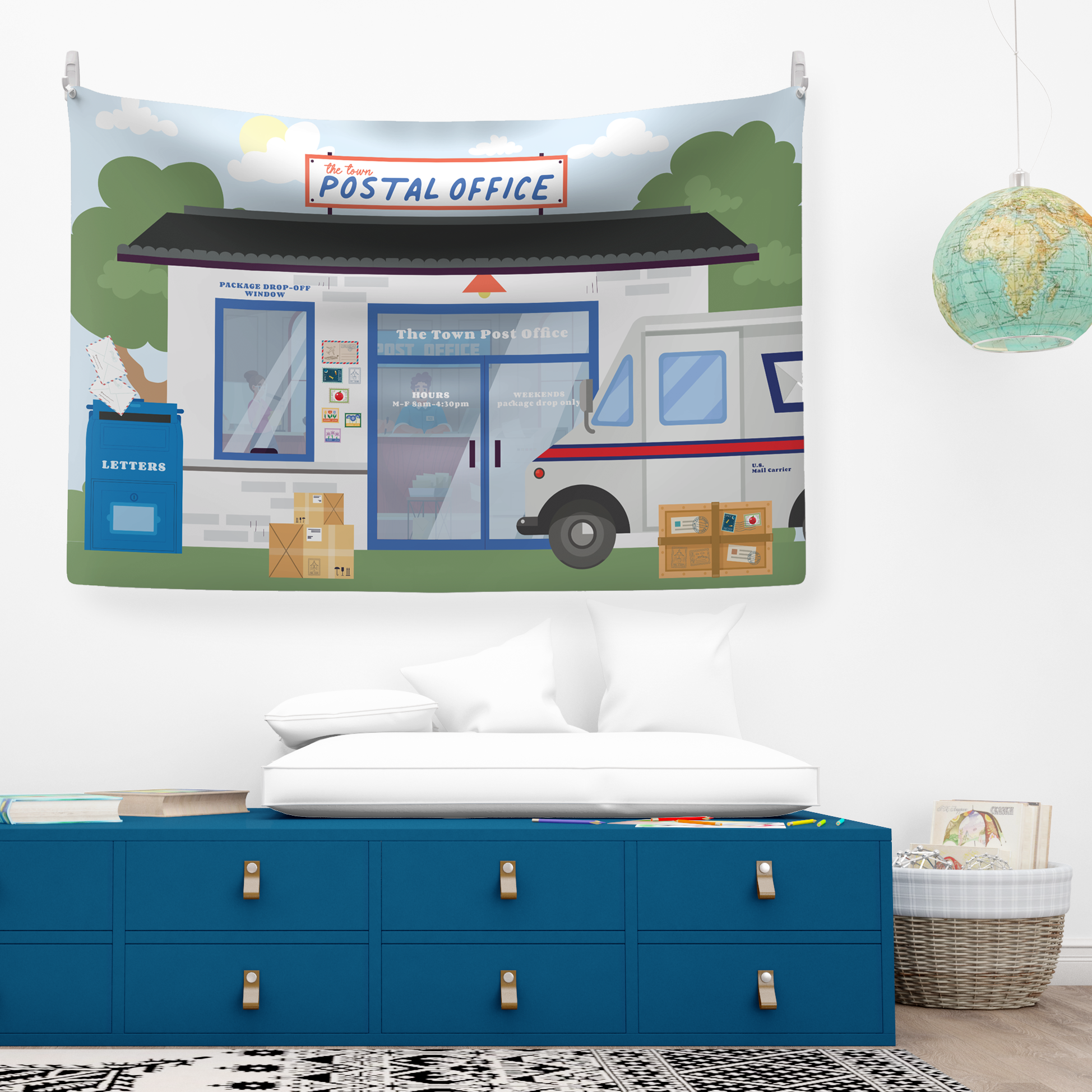 Deliver Big Fun with This Kids’ Post Office Play Backdrop!Send imaginations soaring with this charming pretend play post office tapestry! Featuring a cheerful post office facade complete with a friendly mail truck and bright details, this wall backdrop turns any space into a bustling mailroom adventure. Perfect for little ones who love make-believe, it’s ideal for playing postmaster, delivering letters, or sorting parcels. Whether used in a bedroom, playroom, or classroom, this tapestry creates the perfect setting for imaginative play, learning about community helpers, or themed birthday fun. It’s also a delightful gift for curious and creative kids! Product features 100% polyester: durable, soft, and easy to clean—ideal for kids’ spaces Hemmed edges for a polished, long-lasting look Designed with young children in mind to encourage imaginative role play Made from high-quality microfiber sourced from China Care instructions Machine wash cold with like colors on a gentle cycle. Tumble dry low or hang to dry. Do not bleach or dry clean.