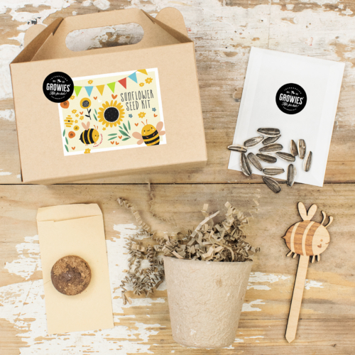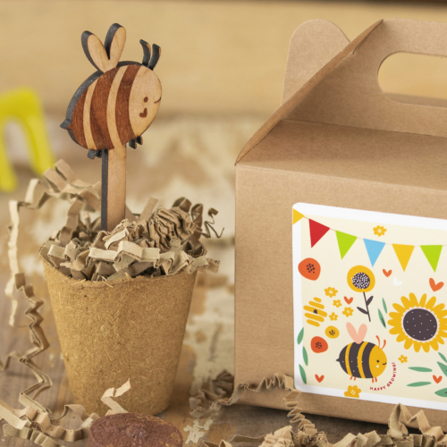 A unique and eco-friendly way to grow sunflowers at home! Each adorable little box comes with a colourful and bright label & inside there’s a 7cm Fibre Plant Pot, a packet of sunflower seeds, a beautifully cut wooden Bee plant tag and a soil pellet.