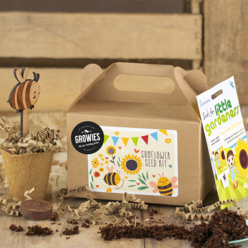 A unique and eco-friendly way to grow sunflowers at home! Each adorable little box comes with a colourful and bright label & inside there’s a 7cm Fibre Plant Pot, a packet of sunflower seeds, a beautifully cut wooden Bee plant tag and a soil pellet.