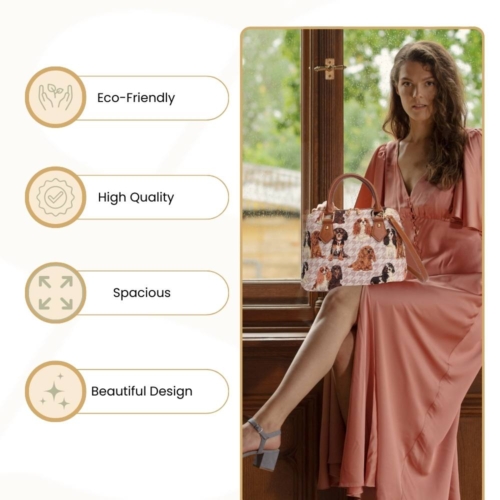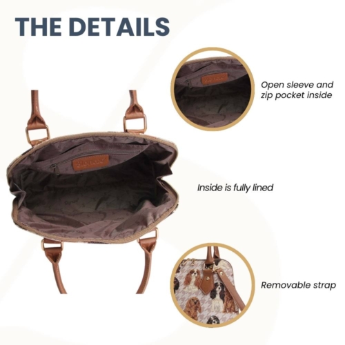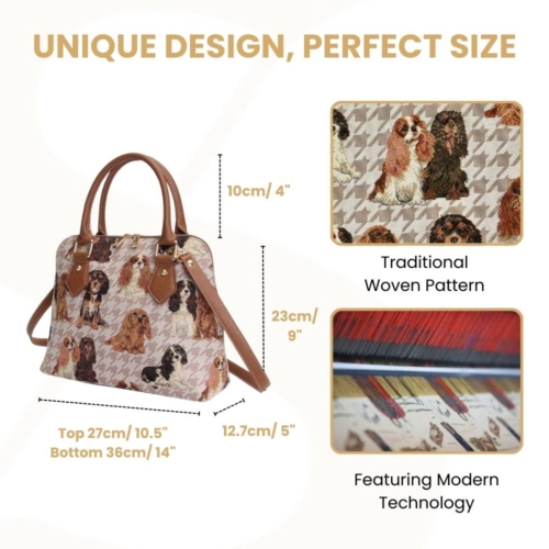 FABRIC COMPOSITION: 100% Polyester.EASY CARE: Clean it with a damp cloth. Do not soak in water.Express your individuality through Signare![custom_html]UNIQUE LIFESTYLE DESIGN: A look of sheer curiosity paints the face of these inquisitive King Charles Cavaliers. The King Charles Cavalier Spaniel puppies invite you to play with them as they coat this wonderful tapestry design with delight. PRODUCT DESCRIPTION: Proven to be one of our most popular tapestry bags with shoulder strap styles and one of the best shoulder bags for women. This elegantly designed classic top handled handbag is one that can serve as a fantastic choice for your everyday needs Brilliant choice for small travel, evening walks or overnight Features a modest area for storing your handbag essentials, with an open sleeve and zip up pocket also featured on the inside Fully lined with a patterned nylon Faux leather handle and detachable shoulder straps included Has the option to be worn as a handbag or converted into a cross body or shoulder style bag Fitted with a full length zip fastener Solid base with 4 studded feet Size: 12.5 x 9 x 5 inches – Weight: 1 lb See All Convertible/Top Handle Purse Bag Designs See All The Styles/Models in King Charles Cavalier Spaniel Collection