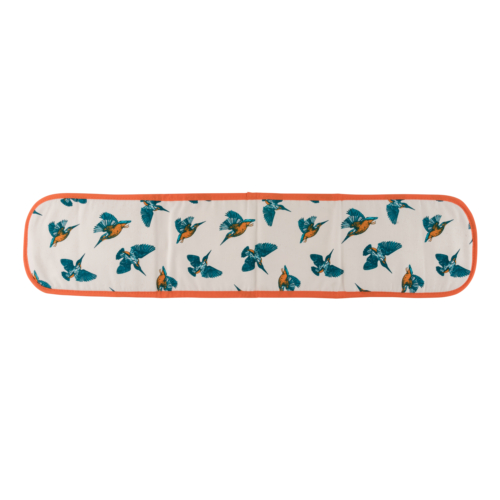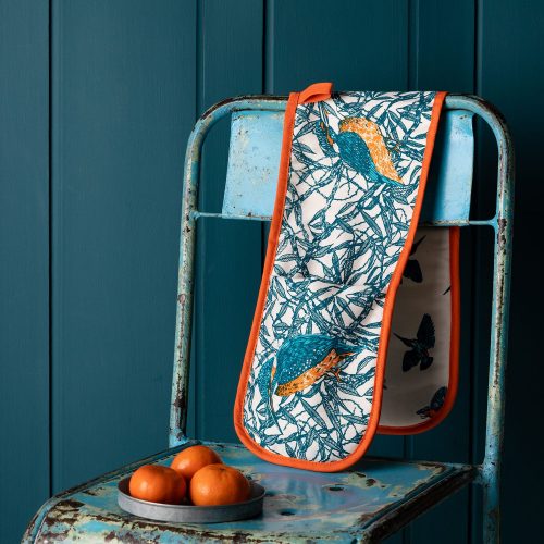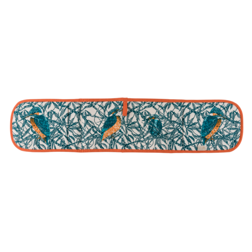 Handmade in the UK the oven gloves are made from unbleached cotton and measure 82cm x 18cm. A red/orange trim finishes off the gloves wonderfully.Machine wash at 30°C.Made from unbleached cotton. The gloves measure 82cm x 18cm and conform to British Standards 6526:1998