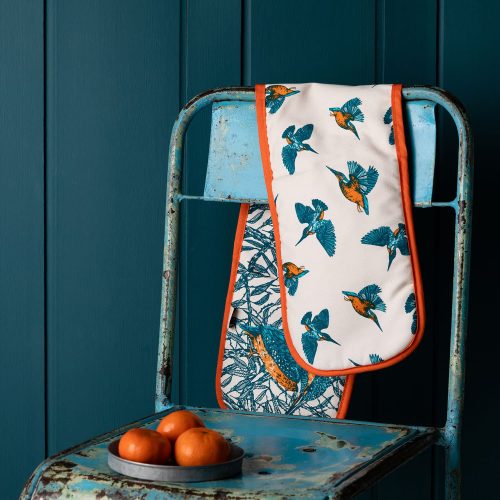 Handmade in the UK the oven gloves are made from unbleached cotton and measure 82cm x 18cm. A red/orange trim finishes off the gloves wonderfully.Machine wash at 30°C.Made from unbleached cotton. The gloves measure 82cm x 18cm and conform to British Standards 6526:1998