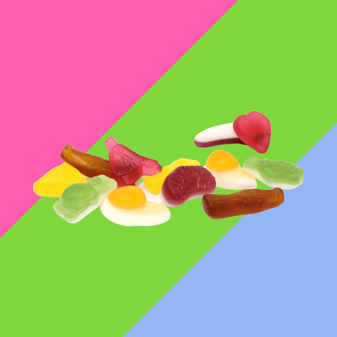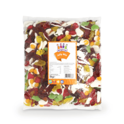 Fruit flavoured jelly sweets A great mix of popular jelly sweets Approx. 600 pieces Looking for a perfect addition to your pick n mix sweet range? Our Kingsway Jelly Mix is just what you need! This bulk 3kg bag contains a mix of popular jelly sweets such as fried eggs, cola bottles, and many more. All the sweets are made without any artificial flavours or colours and are free from gluten and dairy. With so much variety in each bulk bag, these are perfect for making your own mini mixes, too.