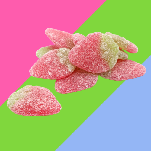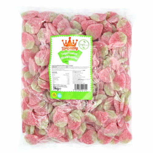 Sugar coated strawberry flavoured chewy sweets A pick n mix favourite Suitable for vegans and dairy free 3kg bulk bag No pick and mix selection is complete with strawberries! These deliciously chewy strawberries are coated in sugar for extra sweetness, packed into a 3kg bulk bag which is perfect for topping up your pick and mix bins. These sugar coated strawberries offer the sweet flavour sensation your customers are looking for, and they are suitable for vegans, dairy free, and made with no artificial flavours or colours, so everyone can enjoy these sweet treats. Why not pack them into smaller bags for a more traditional style of sale?