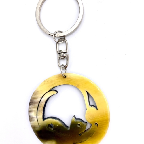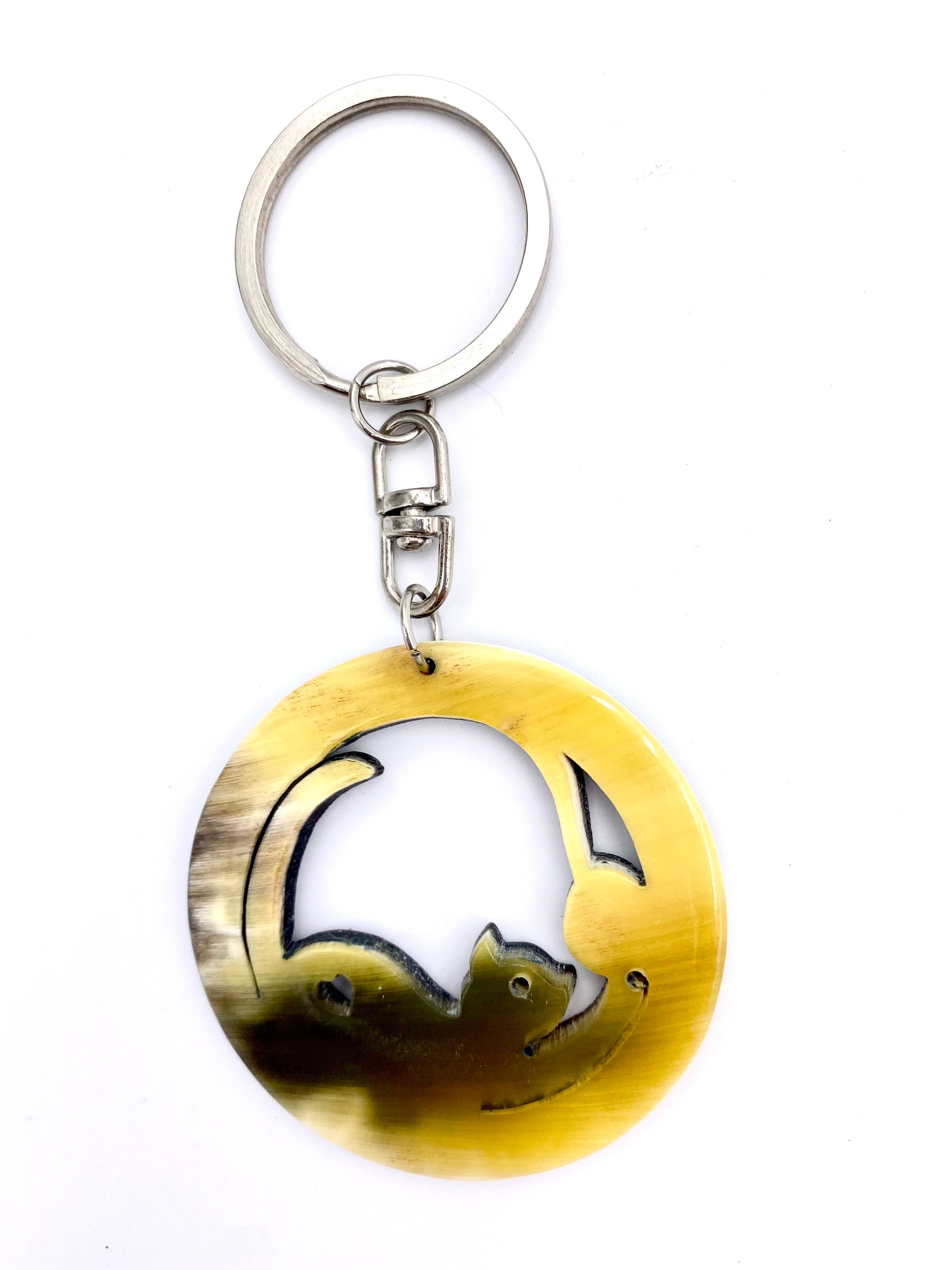 This eco-friendly handmade key chain is made from natural discarded and recycled bull horn crafted by Peruvian artisans. We designed with the artisan based on their technique, tradition, and tools experience.After boiled and melted, each unique piece has been hand cut, molded, carved, and polished to bring out the natural horn color and texture in a brilliant finish.Size: 2 inchesColor: One of a kind based on its natural coloring ranging from black, dark brown, beige, tan or white. Production: Preparing to work the bull horn is arduous. This piece took approximately 2 days by a single-family workshop to complete. All production was done in the suburban of Lima region of Peru.Carbon Footprint: The production and transportation of this piece resulted in 9 pounds of CO2 emission, roughly equivalent to driving 10 miles in a car. This is a Carbon Zero product as its footprint has been offset through the purchase of carbon credits.