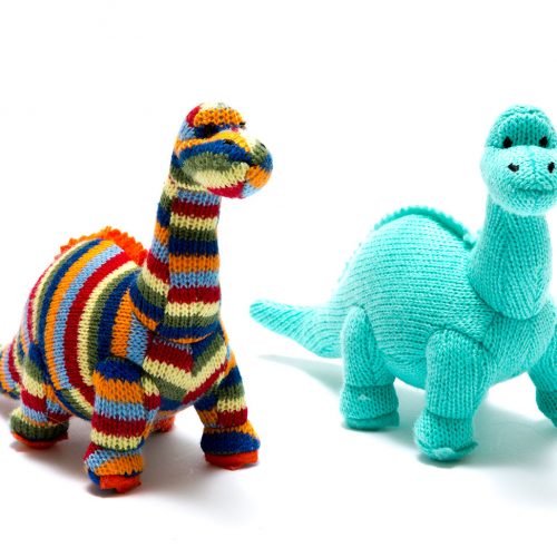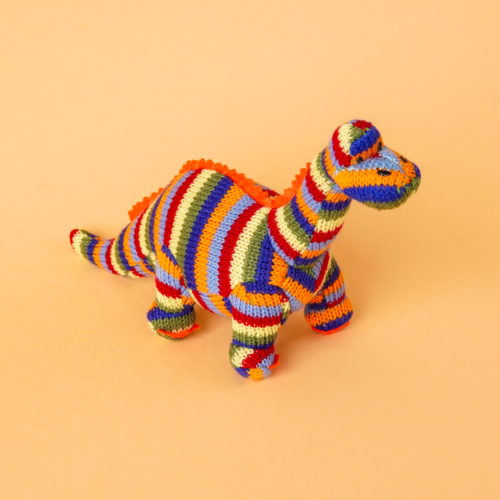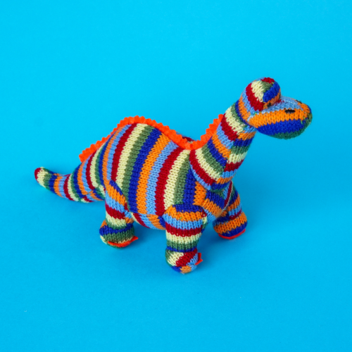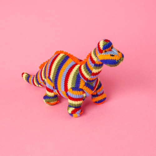 Made from tactile knitted fabric in a bright stripes, our Diplodocus dinosaur soft toy is sturdy and robust, perfect for play. The bright colour and tactile fabric make this a great toy for babies and young children.