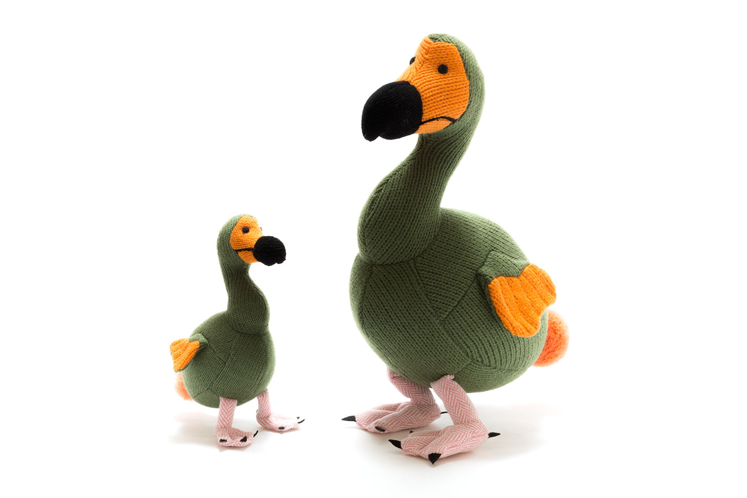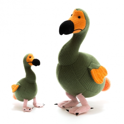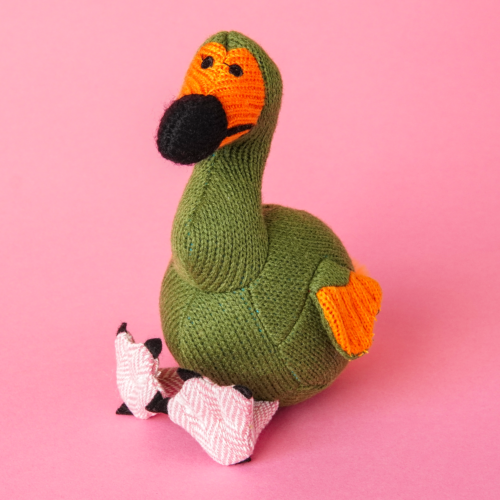 Dodo knitted soft toy in moss green with pink webbed feet. The dodo may be extinct but she is alive and well in the Best Years range.
