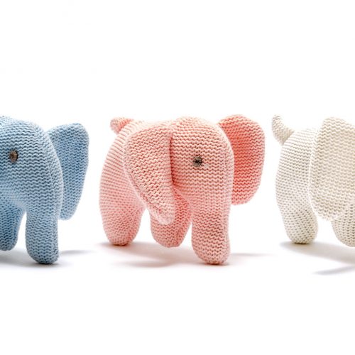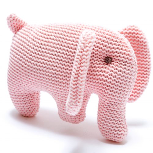 Tactile and soft knitted organic cotton pink elephant baby rattle. Ideal baby gift or baby hamper toy.