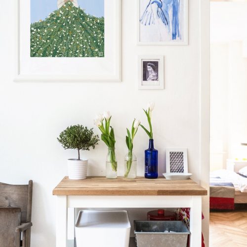 A loving knitter works on a blanket of flowers. Avid knitters adore this print and it adorns many a creative space already!