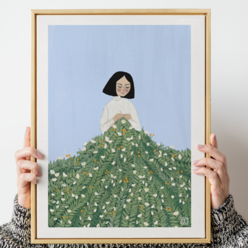 A loving knitter works on a blanket of flowers. Avid knitters adore this print and it adorns many a creative space already!
