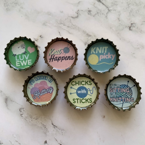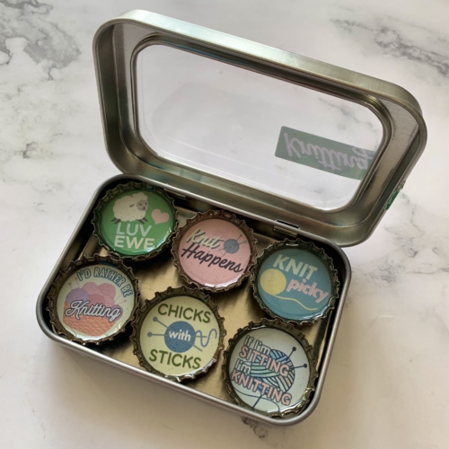 Six-pack set of knitting themed magnets, made in the USA from recycled bottle caps. Our magnetic expressions make fabulous and unique gifts and can be used in the kitchen, office or on any magnetic surface. Each magnet set comes in the display tin (just like in the picture) and the magnets are strong enough to hold the entire tin on a magnetic surface for display.