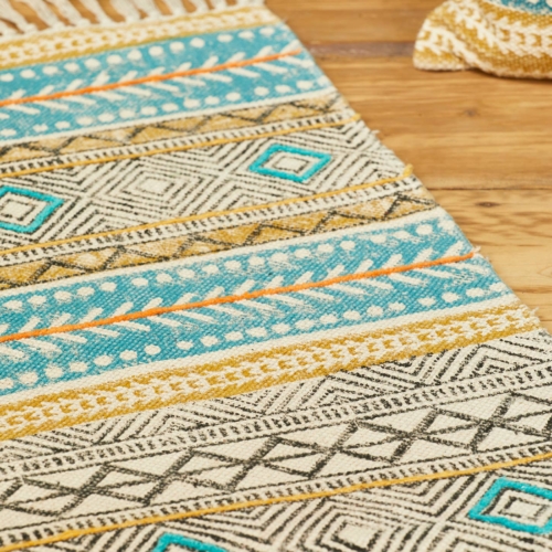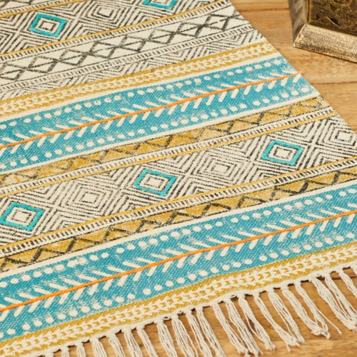 Kota is a block print area rug in mixed geometric bands of blue and gold. Hand embroidered recycled threads of gold and amber run across the rug, accompanied by embellishments of raised turquoise diamonds. The textile’s natural weave enhances the hand applied pattern and colour palette to complete a fresh, invigorating design that will lighten and brighten a living room or bedroom. Finished in neutral end fringes and a plain weave reverse. Matching Kota cushion covers in 2 sizes are available.75 x 135cm90% Cotton, 10% Other Recycled ThreadsThe hand crafted nature of this range means every piece is unique. Slight variations are exclusive characteristics, reflecting Artisan creativity using traditional techniques.Gently vacuum without a beater bar. Blot spills immediately using clean paper towels and do not rub. Consult a specialist for stains and large areas.