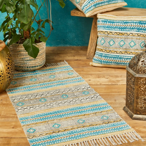 Kota is a block print area rug in mixed geometric bands of blue and gold. Hand embroidered recycled threads of gold and amber run across the rug, accompanied by embellishments of raised turquoise diamonds. The textile’s natural weave enhances the hand applied pattern and colour palette to complete a fresh, invigorating design that will lighten and brighten a living room or bedroom. Finished in neutral end fringes and a plain weave reverse. Matching Kota cushion covers in 2 sizes are available.75 x 135cm90% Cotton, 10% Other Recycled ThreadsThe hand crafted nature of this range means every piece is unique. Slight variations are exclusive characteristics, reflecting Artisan creativity using traditional techniques.Gently vacuum without a beater bar. Blot spills immediately using clean paper towels and do not rub. Consult a specialist for stains and large areas.