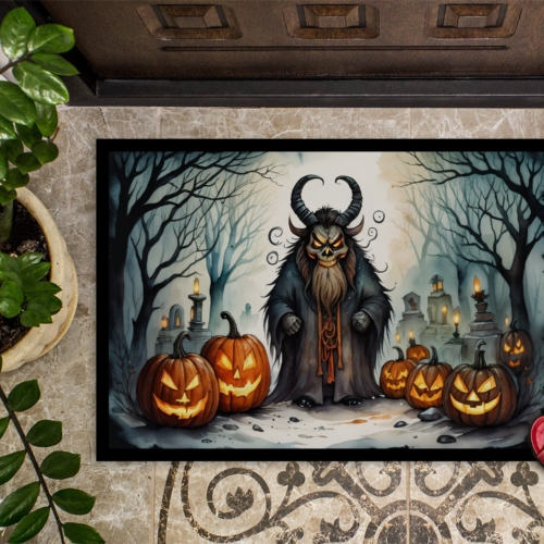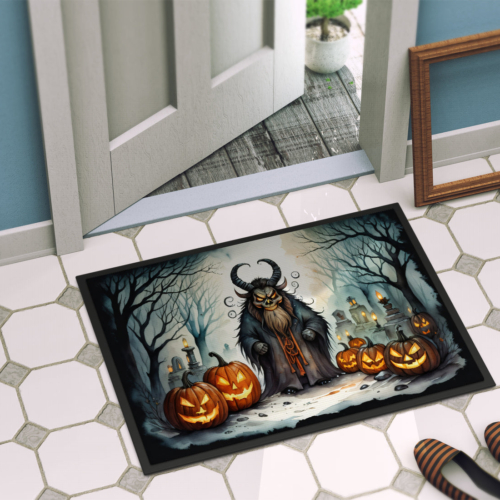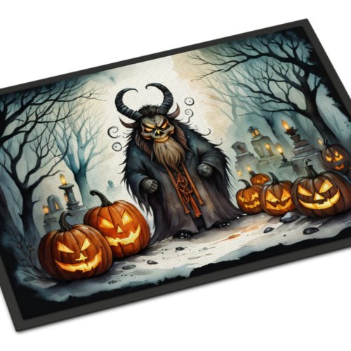 Celebrate Halloween with this Halloween Doormat. Welcome your guests in style with our Artwork Door Mat, designed to withstand almost any weather condition. This mat, measuring approximately 18 by 27 inches, is held together by durable black binding tape. Its top layer, composed of polyester felt, is dyed with the eye-catching image you see on the mat. A few layers below provide the mat with stability, while its rubber bottom is stamped to help prevent slipping and ensures safety. Our mat works wonderfully as both an indoor or outdoor door mat. For cleaning, simply hose it off with water or use a power washer – no need for any cleaner that produces suds. Avoid scrubbing with a brush, instead, opt for the vacuum on floor setting. Designed manufactured and printed in the USA, this mat is a perfect addition to your porch, outdoor kitchen, entryway, or any indoor space. Its unique design makes it a charming decorative rug that greets your guests and adds a stylish touch to your home decor.