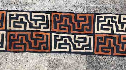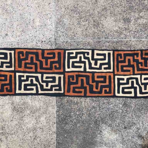 This type of Kuba cloth, known as “bushoong” is a durable fabric made of raffia: the background is a hand-woven black and features a zig zag central pattern with embroidered squares throughout. The zig zag is framed by natural straw-color and light brown geometric appliqué designs. Handmade in the heart of The Democratic Republic of the Congo, the background cloth was woven by a male of the Bakuba tribe. Women typically accent the textile using sewing on the appliqués by hand. Kuba cloths are woven as a symbol for a person, couple, or family; thus having extravagant designs, patterns and shapes as a symbol of artistic creativity and workmanship. This textile measures 126 x 22″ (320 x 56 cm)