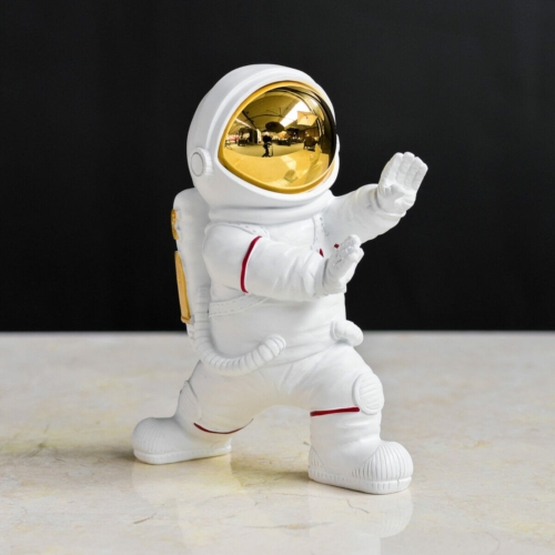Standing at 18 centimetres in height, the Kung Fu Astronaut is a whimsical and charming figurine, a delightful fusion of space exploration and martial arts, designed to spark the imagination. The astronaut figurine is meticulously crafted with a resin finish, giving it a smooth and glossy appearance. Its compact dimensions of 12 centimetres in width and 7 centimetres in depth make it a perfect addition to any display shelf or desk. The astronaut’s suit gleams with a reflective gold visor, symbolizing the radiant spirit of exploration and adventure. This visor catches and reflects light, adding a touch of magic to the figurine. In this playful yet graceful pose, the astronaut embodies a sense of harmony and balance, as if they are mastering the art of Kung Fu amidst the cosmic void. Their bulky spacesuit takes on a dynamic and agile quality, defying the constraints of gravity as they navigate the infinite expanse of the universe. A charming representation of human curiosity and determination, reminding us that even in the depths of space, there is room for whimsy and wonder. This figurine serves as a reminder of the endless possibilities that await those who dare to reach for the stars. Height : 18cm, width : 12cm, depth : 7cm Reflective gold visor Resin finish
