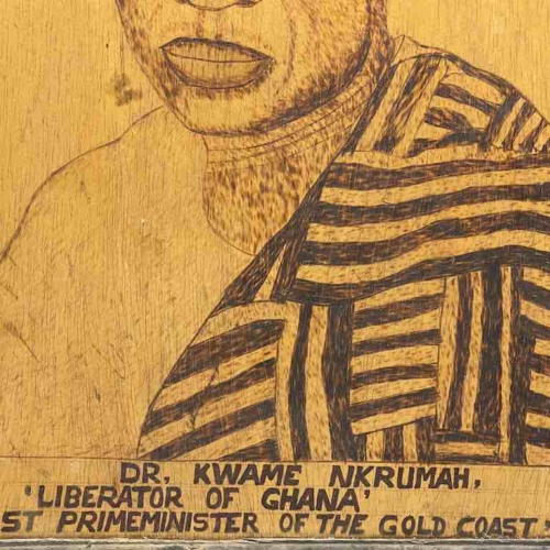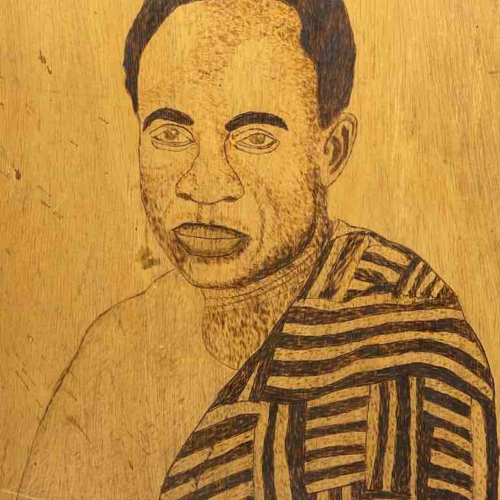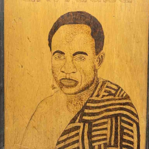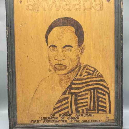 Artists in Africa are increasingly expressing themselves through contemporary art media. This is an unusual medium for artistic expression, wood burned portraiture. This is a portrait of the Kwame Nkrumah, the first president of Ghana, here dressed in full traditional regalia. The title “Akwaaba” means “Welcome”. The artist has signed this work, Richard Ankoman This measures 22 1/2 x 17 3/4″ (57 x 45 cm)