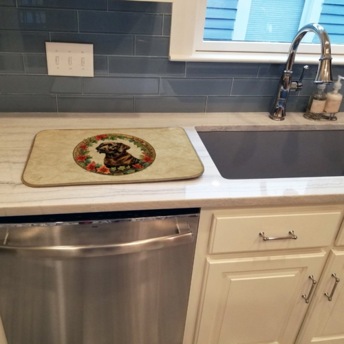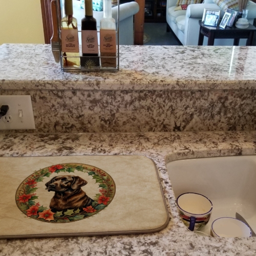 Dish Drying Mat featuring breed specific Labrador Retriever artwork. Celebrate Christmas with this Christmas Dish Drying Mat. Say goodbye to messy countertops and soggy dish towels with our innovative dish drying mat. Our high-quality dish drying pad is designed to keep your countertops dry while offering a stylish and efficient solution. Whether you’re air drying dishes, glasses, stemware, silverware, pots, pans, bottles, or even fruits and vegetables, our dish mat is the perfect choice. The 14 inches x 22 inches size fits most counters and dish drying racks, and the non-slip design ensures stability. Made with water-absorbent polyester and a polyurethane foam insert, our dish drying mat is not only functional but also durable. It’s machine washable and printed in the USA for long-lasting use. The beautiful artwork adds flair to your kitchen decor, making it a perfect housewarming gift or present for any occasion. Upgrade your kitchen experience with our absorbent and versatile dish drying mat.