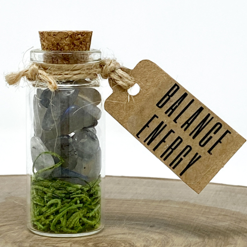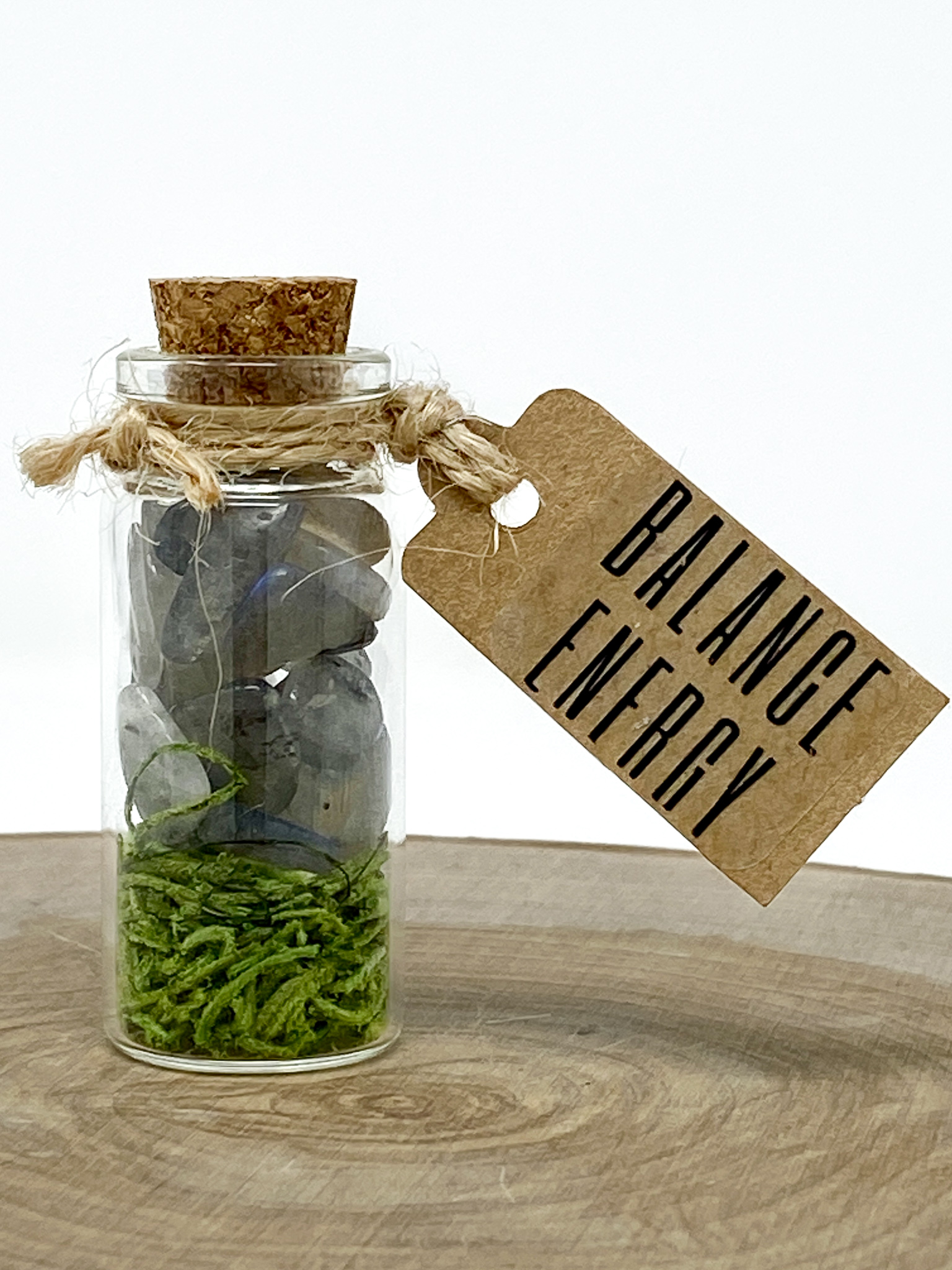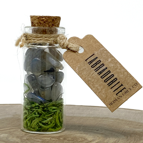 Labradorite crystals rest on a bed of Spanish moss in a glass vile with a cork closure.