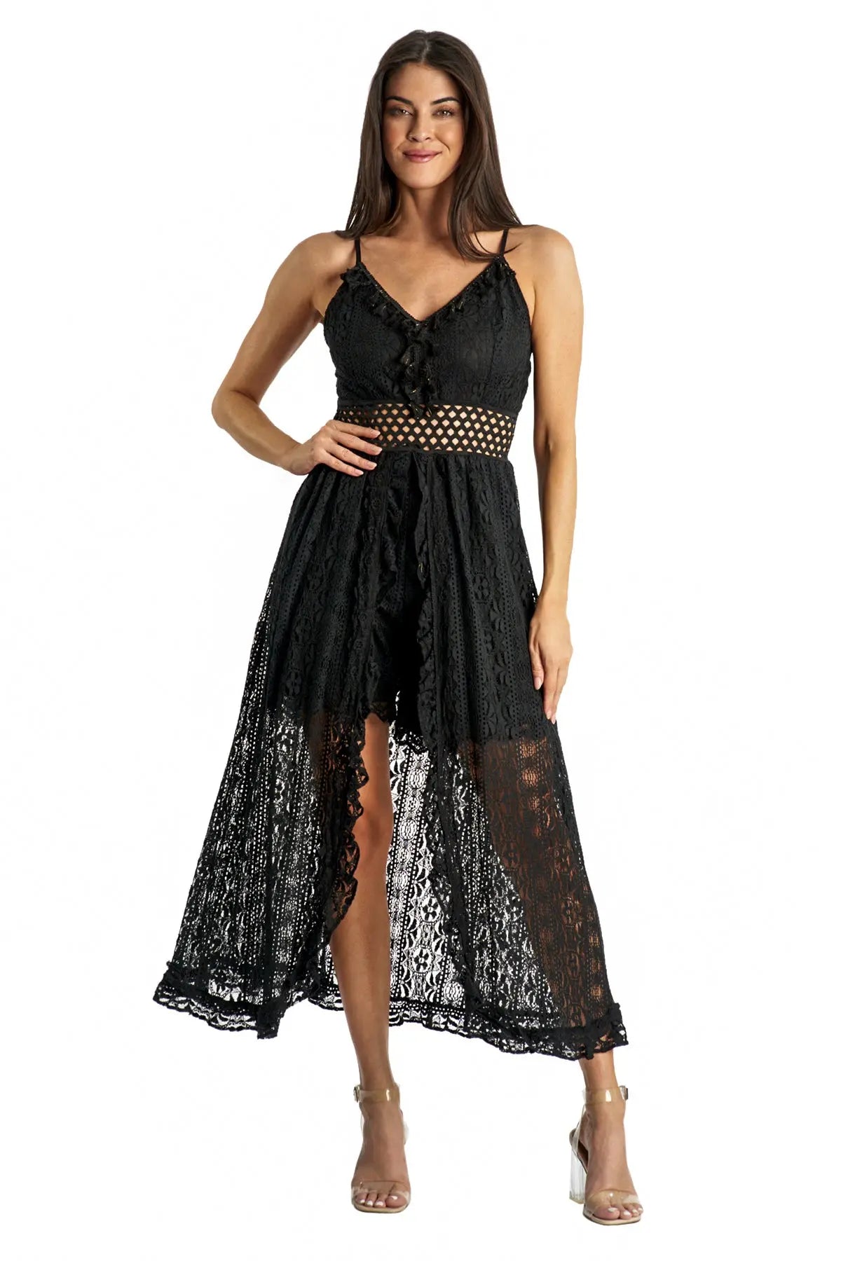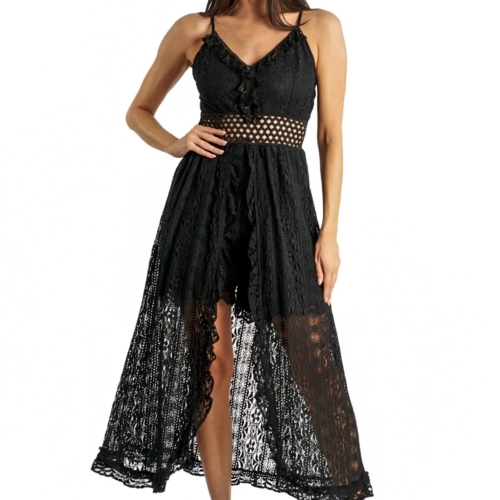 Women’s Lace Romper Dress with Shorts Women’s Lace Romper Dress with Shorts. Beautiful Beachy summer outfit to use both during the day and in the evening. embroideredlace dress, with V-neck, open at the center with short shorts underneath. Embrace your free spirit with this V-neck Lace Trims Sleeveless Jumpsuit. Detailed with a lace trim and fit waist, it’s just the right amount of casual and flirty. Pack of 6 Pcs