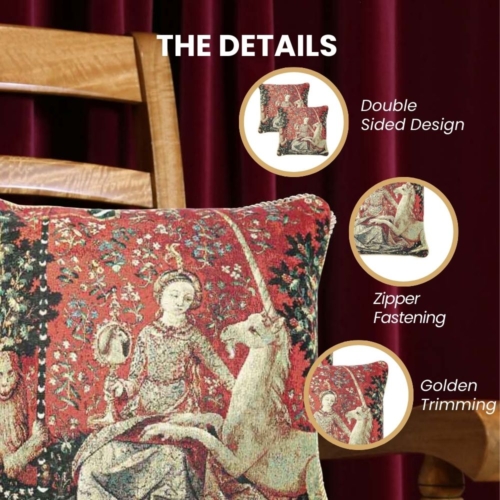 FABRIC COMPOSITION: 45% polyester, 55% cotton.EASY CARE: Clean it with a damp cloth. Do not soak in water.Lighten up your home with decorative pillow covers for couch.[custom_html]UNIQUE LIFESTYLE DESIGN: From our collection of pillowcases or cushion covers based on the Mediaeval tapestries, the Lady and the Unicorn, the scene in this cushion design represents the sense of sight. It depicts the unicorn kneeling, front legs resting on the lady’s lap while looking into a mirror she is holding. This series of decorative cushion covers will complement beds or sofas in any unicorn themed room. PRODUCT DESCRIPTION: A decorative pillowcase that is sure to liven up any room in the house This modern, tapestry cushion design makes the perfect scatter cushion for a modern finish and is a welcome addition in any home Pillow covers 18×18 inches The unique cushion covers have a double-sided tapestry cushion with a piped edge Concealed zip on one end to allow pad to be removed for washing or replacement The drawing is represented on both sides Size: 17.7 x 17.7 x 0.4 inches – Weight: 0.4 lb See All Pillowcase Designs See All The Styles/Models in The Lady and The Unicorn Collection [/custom_html]