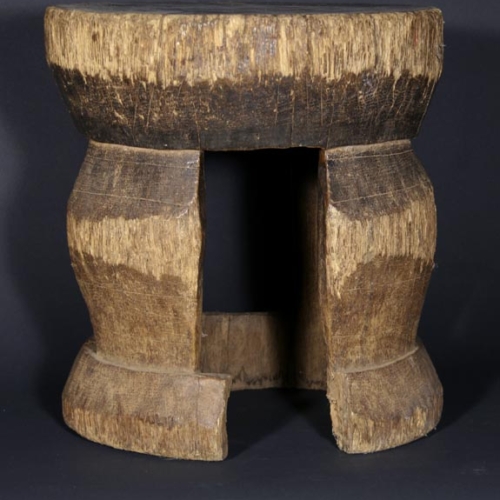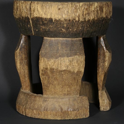 This is a nice example of the stools you find in almost every compound in the African bush. At 16″ tall and 13 1/2″ in diameter (41 x 34 cm diam.) this one is quite large by comparison with most. The vast majority of Africans live in villages rather than cities and most of those live in “compounds”, groups of huts, usually round, each belonging to a member of one family. Furniture is limited; the most common item of furniture is the round stool of which this one is very characteristic though most are much smaller than this one. Most often these common stools are used outside and get moved around quite casually so are not maintained in the way we tend to maintain our furniture; a lot of wear is always common. This one has lots of wear around the sides and the top is very heavily patinated. The base of this one broke in normal use but was still – and remains to this day – useful so it continued to be used even in its imperfect condition.